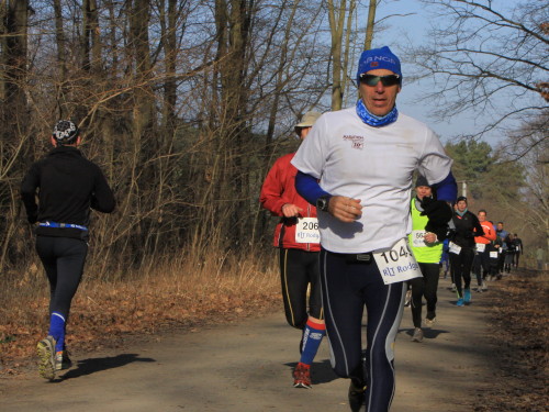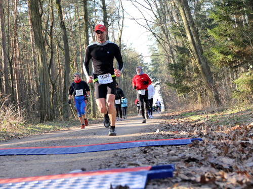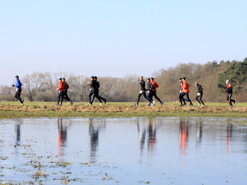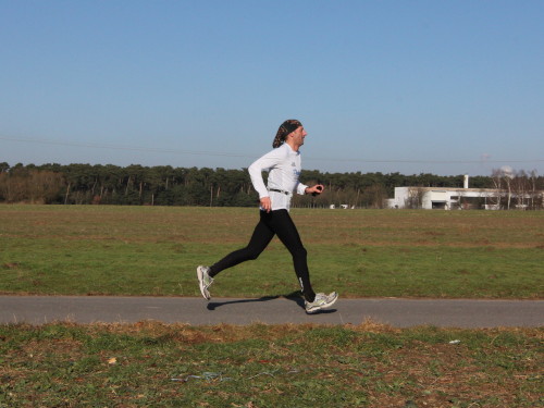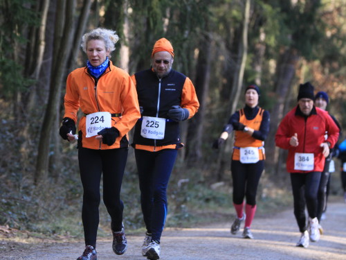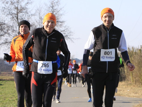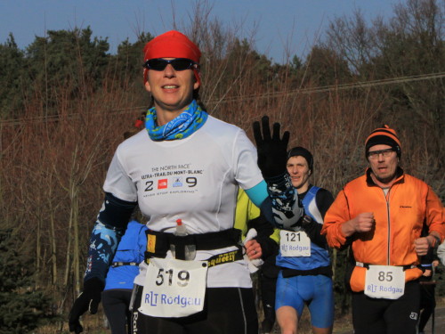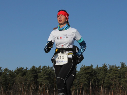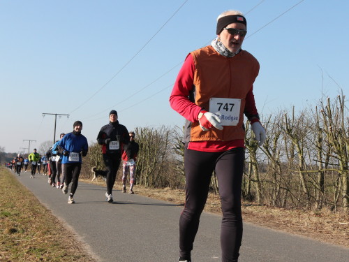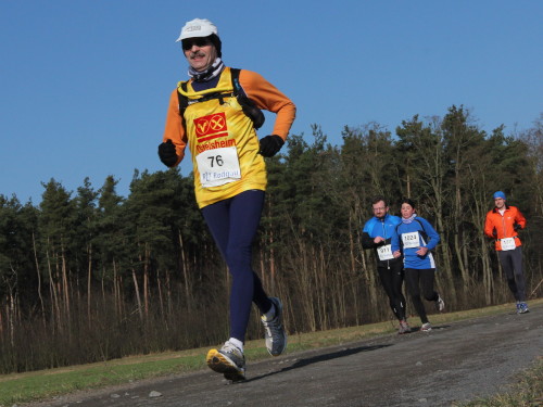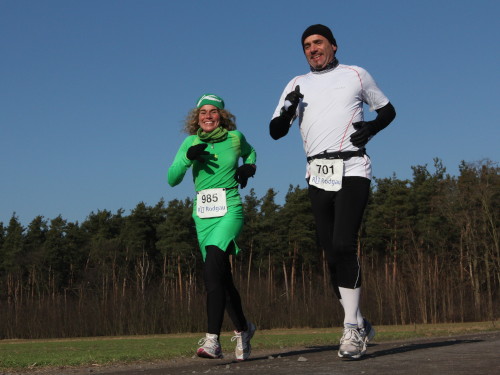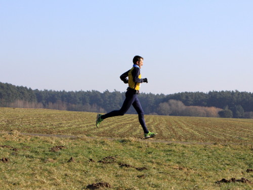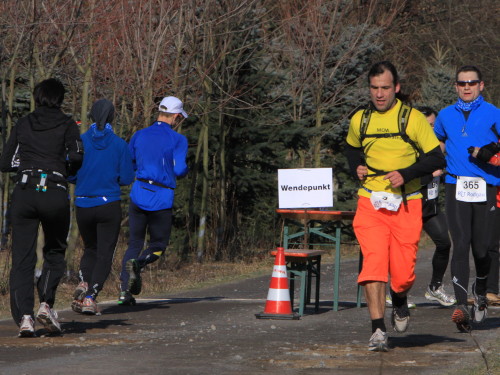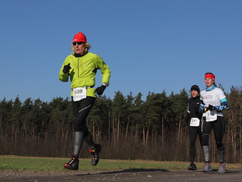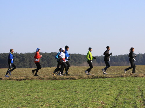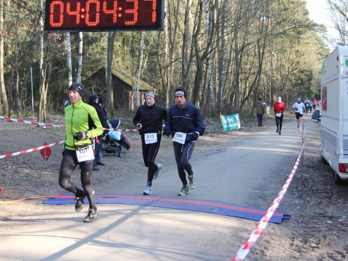 Ich bin k.o.. Wolfgang, Daniel und Markus habe ich ziehen lassen müssen. Zumindest in Sichtweite (und die ist dank der Mützen sehr weit) versuche ich Ihnen hinterher zu schleichen. Gehen will ich auf keinen Fall, das ist für mich schlichtweg eine Frage der persönlichen marathonischen Ehre. Ein letztes Mal ziehen Wald und Feld an mir vorüber, mir kommt es allerdings diesmal vor, wie in Zeitlupe. Für heute ist es genug. Noch ein letztes Mal muss ich über den “Berg” bei km 4, dann darf ich dem Ziel entgegen traben und hoffe nur, dass ich mich beim Rundenzählen - denn das muss jeder eigenverantwortlich für sich erledigen - nicht verrechnet habe.