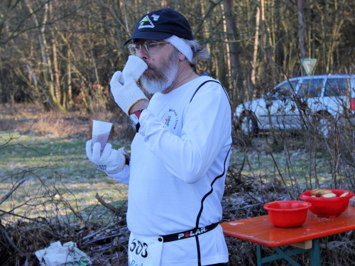 Im Ziel ist für die Einläufer eine weitere Versorgungsstelle eingerichtet. Dankbar schlürfe ich den angebotenen heißen Tee. Kaltes Bier, selbst Malzbier, gäbe es auch, aber danach ist mir jetzt nicht zumute. Wer keine Jacke deponiert hat, kann sich mit einer Folie gegen die schnell in den Körper kriechende Kälte schützen. Die meisten hält es aber nicht lange im Zielbereich, was jedoch nicht heißt, dass die Veranstaltung damit zu Ende ist: Denn nun ist Feiern angesagt. Allerdings muss man zunächst noch die 850 Meter Rückweg zur Sporthalle überstehen.