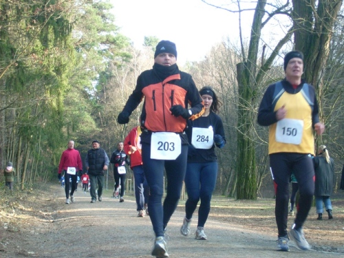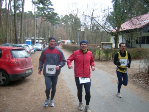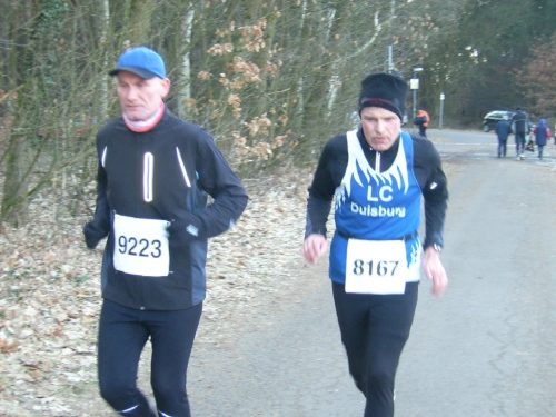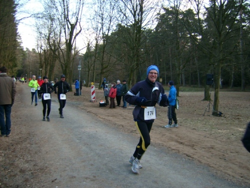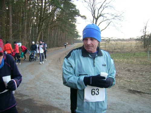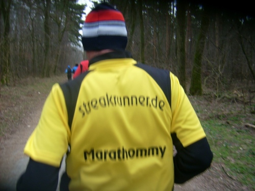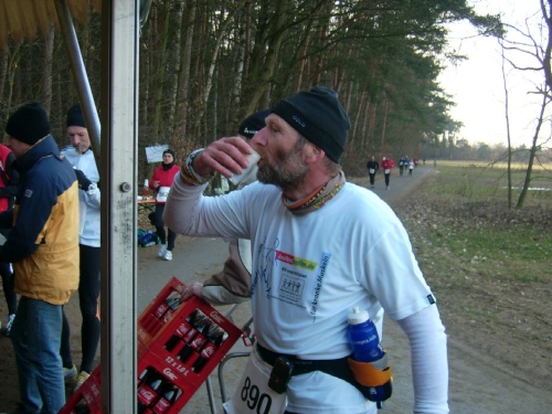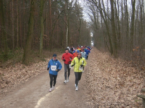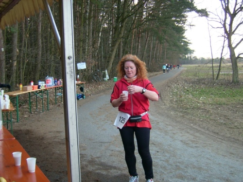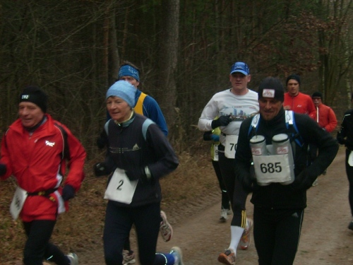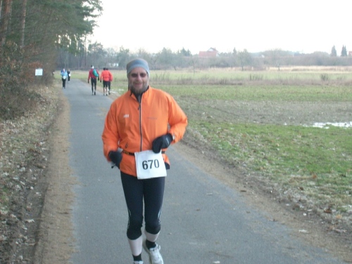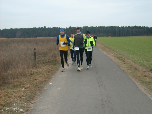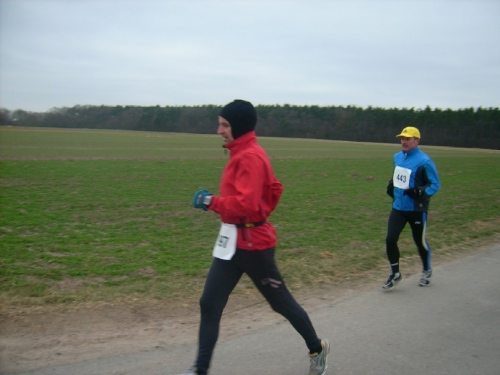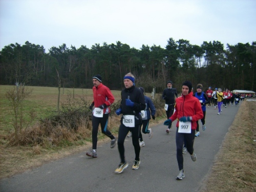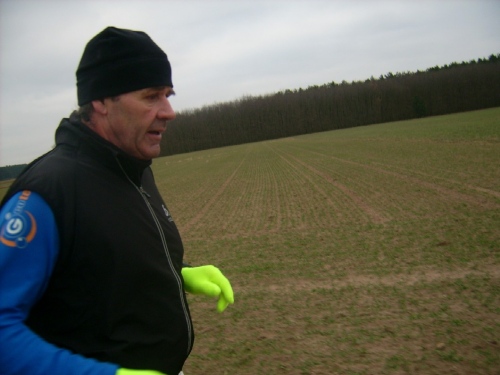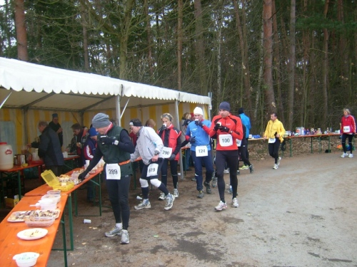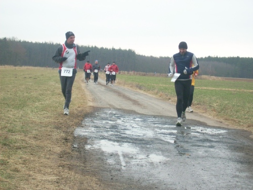 Startschuss, Runde eins: Ohne Hektik setzt sich das Feld in Bewegung, wohl wissend, dass es ein langer Weg werden wird. Und: Abgerechnet wird zum Schluss. Nach einem 400 Meter langen leichten Gefälle geht es nach einer scharfen Rechtskurve am Waldrand entlang. Wir spüren schon den Gegenwind. An der Verpflegungsstelle greift noch niemand zu. Die Helfer stehen schon parat. Kilometerschild eins befindet sich bereits im Bereich der Felder. Der Wind kommt hier von der Seite. Ostwind, der macht halt im Winter die Angelegenheit schwieriger, da er meist Kälte mitbringt.