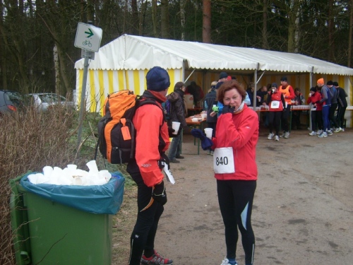 Runde vier: „Der Mann von der Presse“, so werde ich an der V-Stelle begrüßt, als ich zwei von der Mannschaft abschieße. Ja, es gibt hier alles, was der Läufer begehrt. Wasser, Cola, Salzstangen, Salzgebäck, Riegel, Obst. Ich greife mit Vorliebe auf den warmen Tee zurück. Und die Helfer sind sehr aufmerksam, denn wenn man nicht sofort zugreift, wird einem ein Becher schon entgegengehalten.