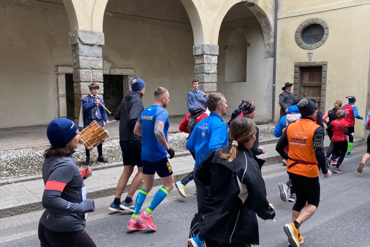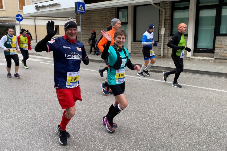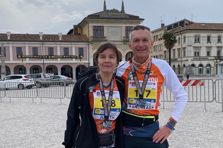Auf einmal kommen wir dem wohlbekannten grün gewandeten Läufer immer näher und auch zwei Damen vor uns müssen oft Pausen einlegen. Das ist unsere Chance. Judith und ich beschleunigen. Ich erwarte eine Laufeinlage des Herrn, aber der ist wohl ziemlich fertig. Beim Km-42-Schild haben wir die italienische Fahne auf dem Hauptplatz und damit das Ziel vor Augen. Die beiden Italienerinnen kämpfen, aber Judith und ich kommen vor ihnen an. Wir werden namentlich begrüßt, bevor der Sprecher sich ausgiebig den Damen zuwendet, die wohl ortsansässig sind und über die ihnen gewidmete Aufmerksamkeit sichtlich gerührt.