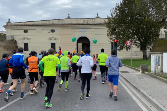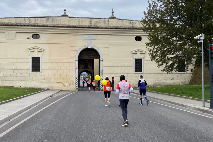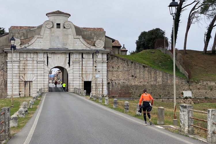 Wir verlassen Palmanova durch das Cividale-Tor. Zu Beginn wird die Stadt zu einem Drittel umrundet und durch das Aquileia-Tor wieder betreten. Zeitmessung am Zielbogen bei km 3,5, dann dasselbe noch mal. Die Anfangshektik ist vorbei und es bleibt nun Zeit, die Bastionen näher zu betrachten.