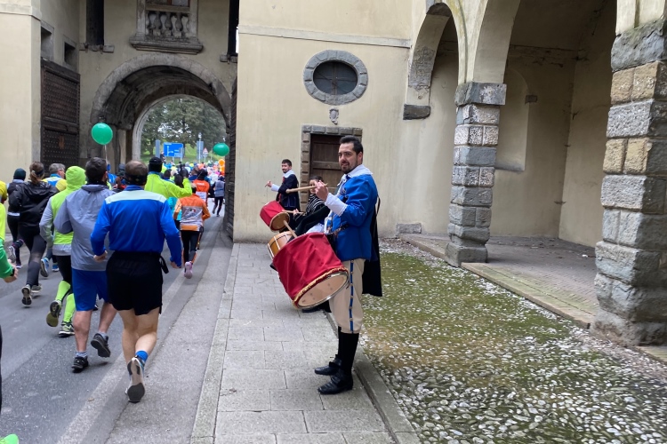 Unser Hotel liegt nahe der zentralen Piazza Grande, wo um 9:30 Uhr der Start stattfinden soll. Wir brechen erst spät auf, es ist doch recht frisch und viele Sportler laufen sich warm. Kurz vor dem Start wird klar, dass dieser nicht unter dem Zielbogen stattfindet, sondern auf der anderen Seite des Platzes, und allmählich vergrößert sich das Teilnehmerfeld. Ich möchte ein Foto vom Startschuss aus einer Kanone machen, doch beim Knall fällt mir vor Schreck fast der Apparat aus der Hand. Nun bin ich am Ende des Feldes und drücke an der imaginären Startlinie ab. Später fällt mir ein, dass es ein Bruttostart war und ich so 90 Sekunden verschenkt habe.