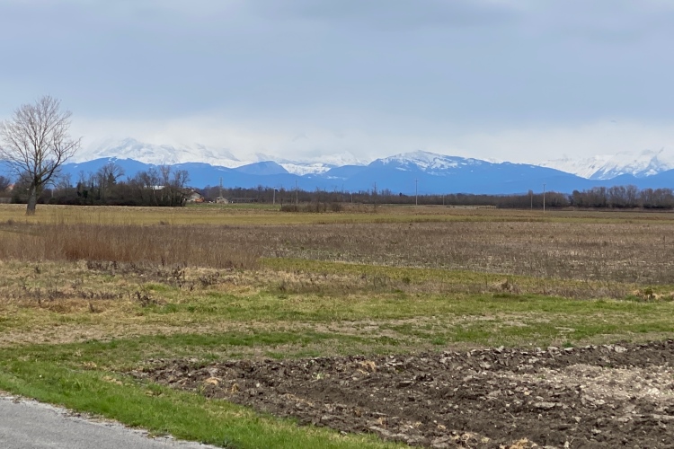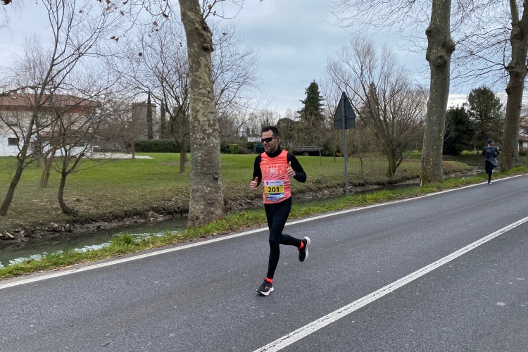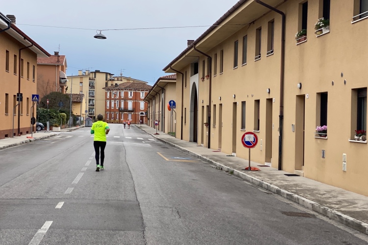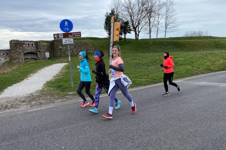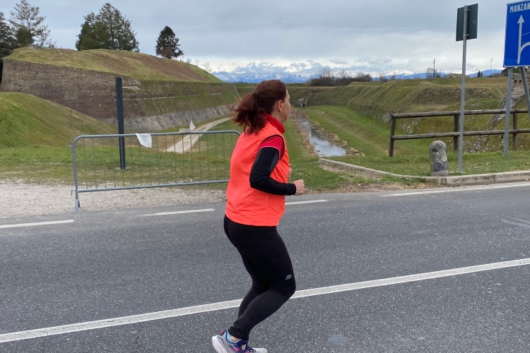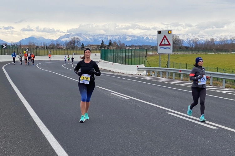 Schön sind die Ausblicke auf die schneebedeckten Alpengipfel. Die Berge beginnen hier viel abrupter als in der bayerischen Heimat, wo es ja ein hügeliges Voralpenland samt niedrigerem Vorgebirge gibt. Hier in Venetien und Friaul erheben sich die Berge unvermittelt wie eine Wand auf ansonsten tellerflachem Land. Flach ist auch die Marathonstrecke, abzüglich der beiden Unterführungen und der Brücke über den Fluss. Palmanova dürfte zwar etwas höher liegen, aber letztendlich bleibt es bei Höhenunterschieden im niedrigen zweistelligen Bereich.