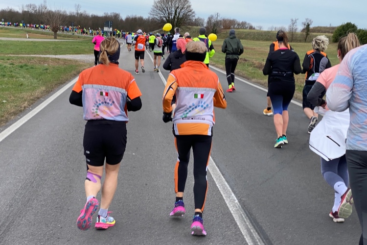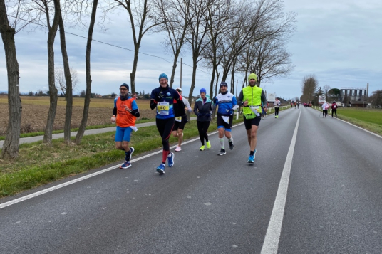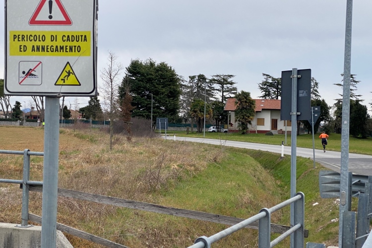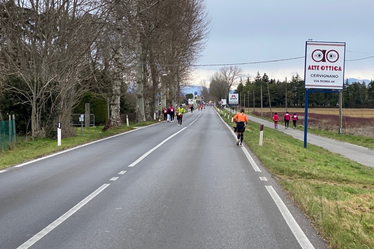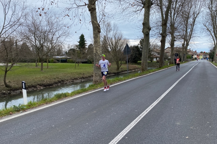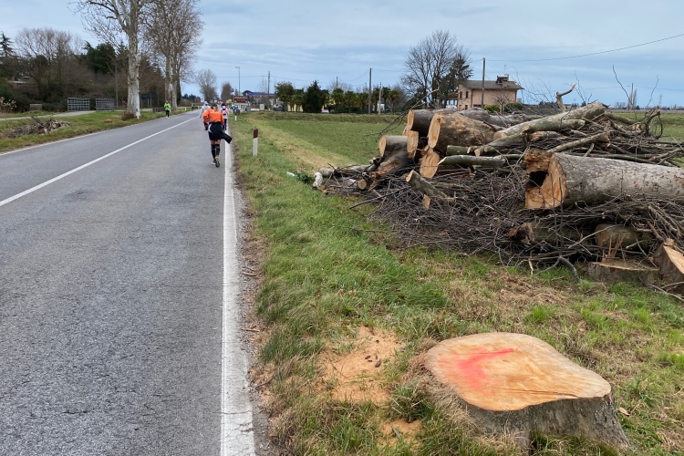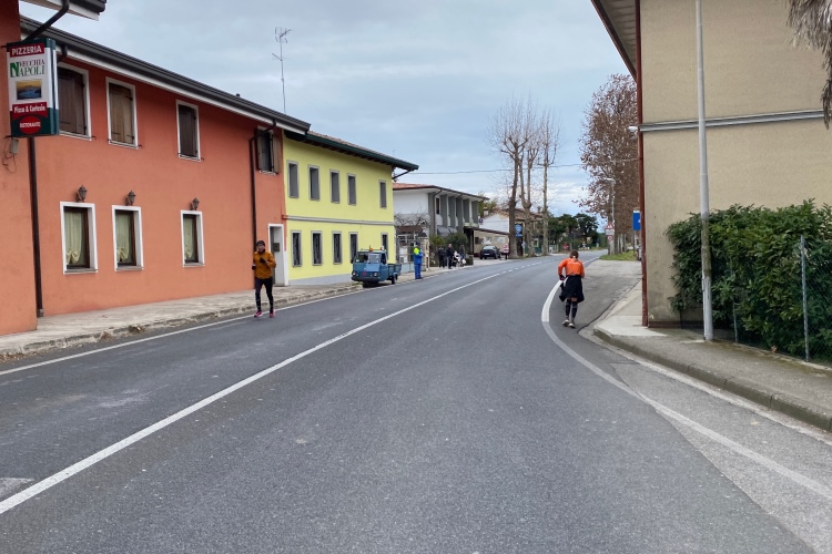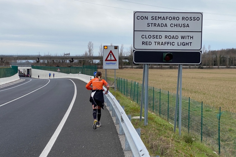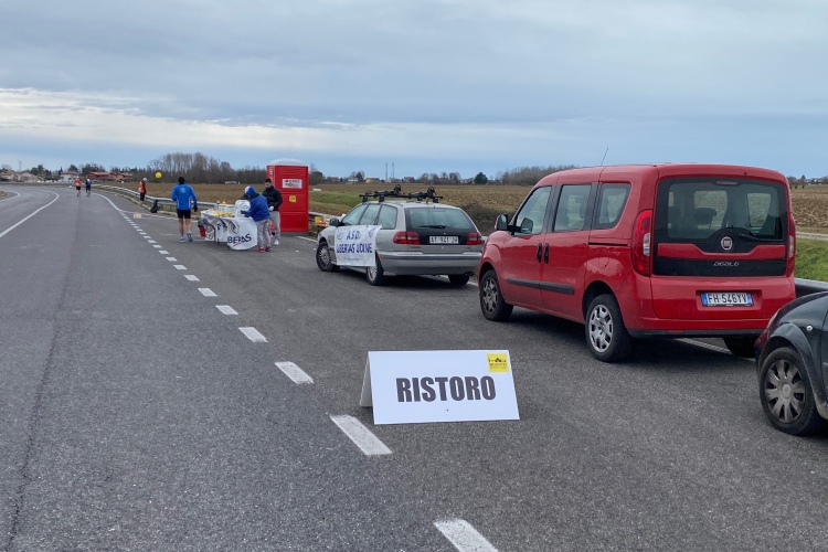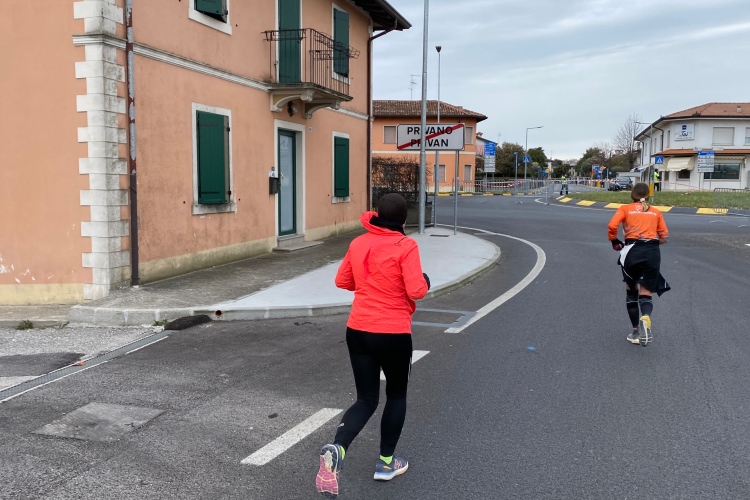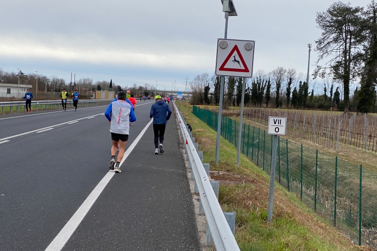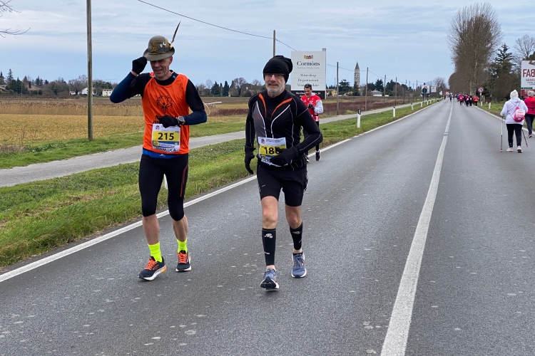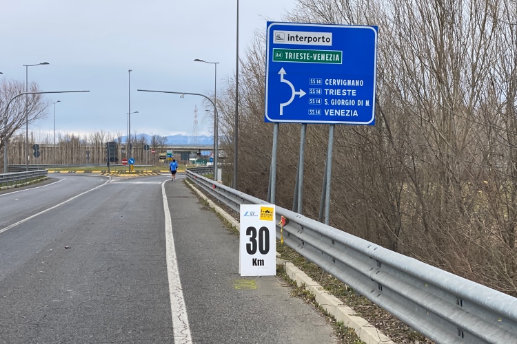 Am nächsten VP, in the middle of nowhere, gibt es nun auch Iso-Getränke. Toilettenhäuschen stehen auch gelegentlich an den Verpflegungsstellen. Ich wünsche den Streckenposten, Mitgliedern eines Sportklubs aus Udine, noch einen schönen Tag. In Sachen Wetter ist allerdings noch „Luft nach oben“, denn die Bora, ein starker Wind aus dem Osten, fegt heute recht frisch über die Ebene und legt anscheinend noch zu. Nicht angenehm. Meine linke Wange ist vom Hinweg gut gekühlt, nun ist also die rechte Seite dran. Interessanterweise war der Wind im Wetterbericht nicht vorhergesagt. Ich freue mich über das enganliegende Hemd vom Bologna-Marathon, das ich als Unterhemd trage. Der Stoff hält schön warm. Oft schützen Sträucher ein wenig vor der heftigen Brise.