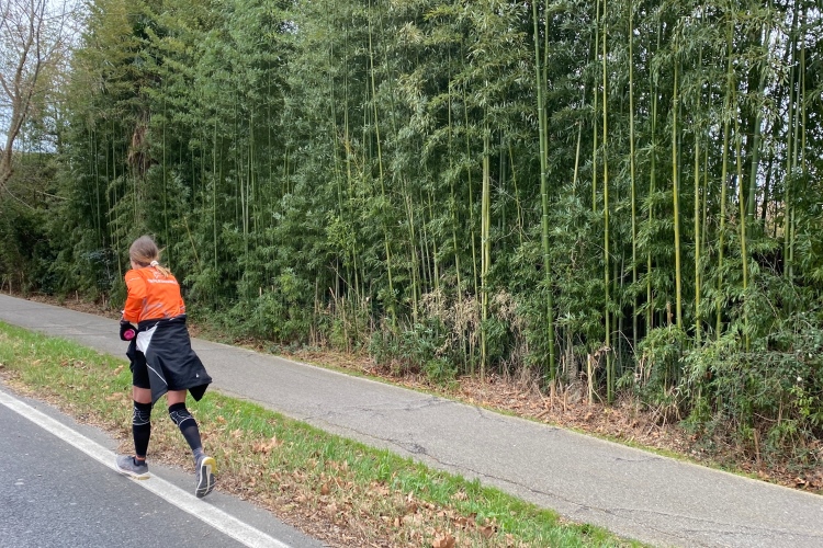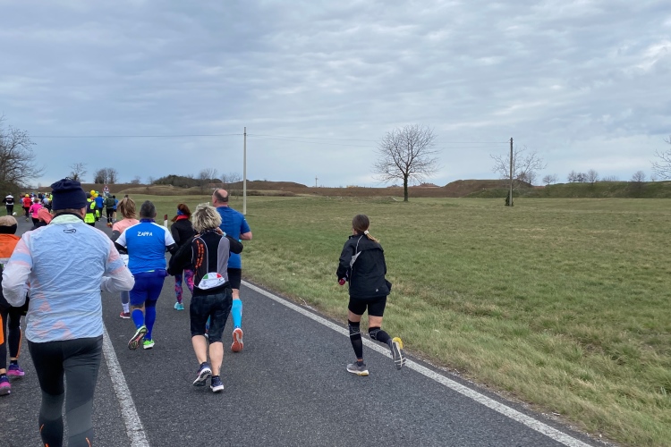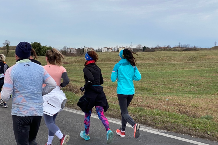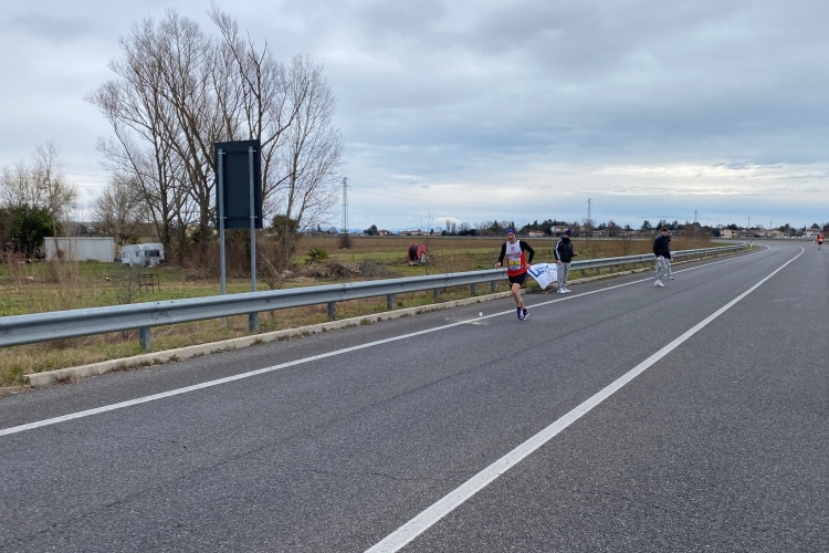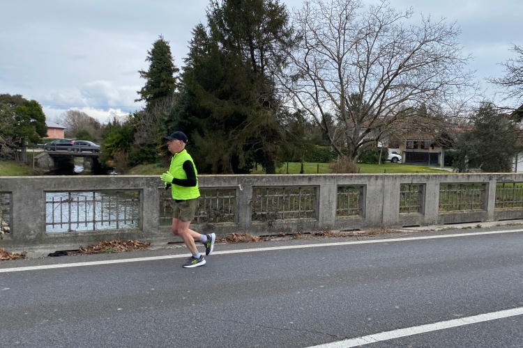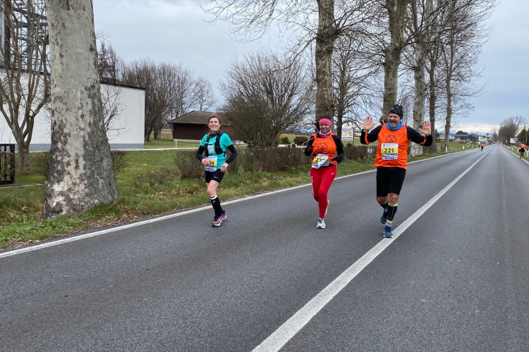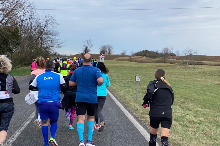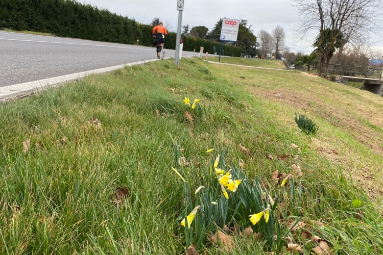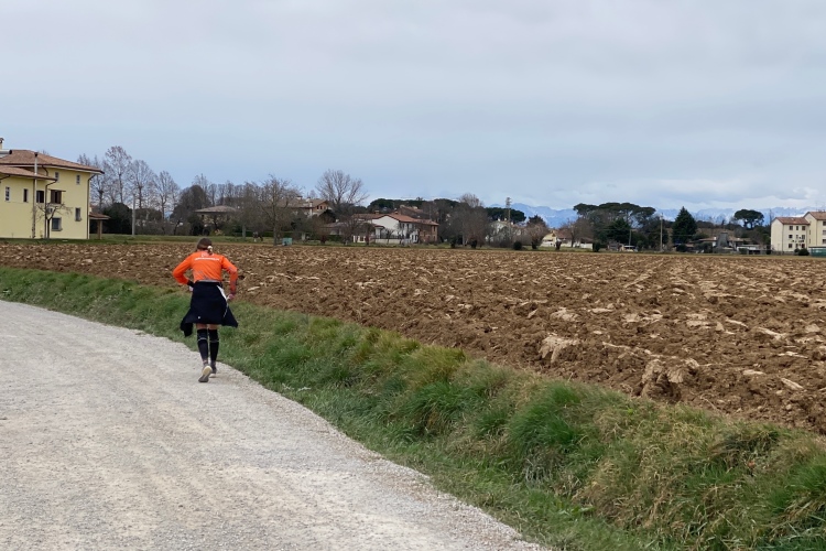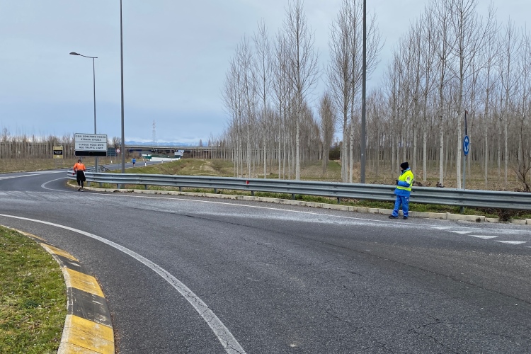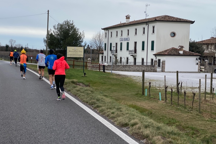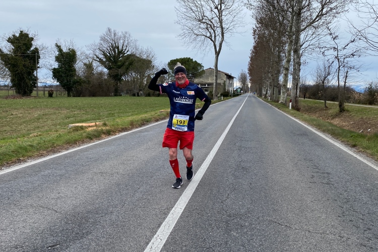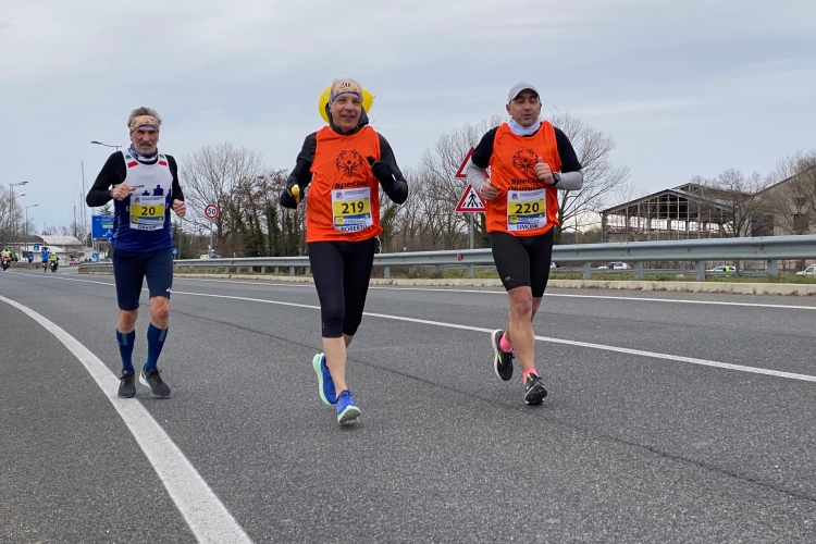 Am nächsten VP, in the middle of nowhere, gibt es nun auch Iso-Getränke. Toilettenhäuschen stehen auch gelegentlich an den Verpflegungsstellen. Ich wünsche den Streckenposten, Mitgliedern eines Sportklubs aus Udine, noch einen schönen Tag. In Sachen Wetter ist allerdings noch „Luft nach oben“, denn die Bora, ein starker Wind aus dem Osten, fegt heute recht frisch über die Ebene und legt anscheinend noch zu. Nicht angenehm. Meine linke Wange ist vom Hinweg gut gekühlt, nun ist also die rechte Seite dran. Interessanterweise war der Wind im Wetterbericht nicht vorhergesagt. Ich freue mich über das enganliegende Hemd vom Bologna-Marathon, das ich als Unterhemd trage. Der Stoff hält schön warm. Oft schützen Sträucher ein wenig vor der heftigen Brise.
