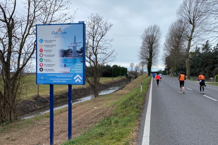Bei Kilometer sieben beginnt unser Weg Richtung Meer. Einige einfachere Häuser liegen am Streckenrand und wir fragen uns, ob sich dort die100-qm-Wohnungen befinden, die im Aushang eines Immobilienvermittlers für 50.000 Euro angeboten werden. Hier kann man für sehr wenig Geld Häuser und Wohnungen kaufen. Die Region gehört zu den wirtschaftsstärksten in Italien und Industrie ist hier gut verteilt. Im Satellitenbild sieht das alles sehr zersiedelt aus. Es folgt nun ein kurzes Stück Schotterweg unter der Autobahn hindurch und dann geht’s auf die Landstraße nach Süden. Bald kommen uns die Führenden des Halbmarathons entgegen.