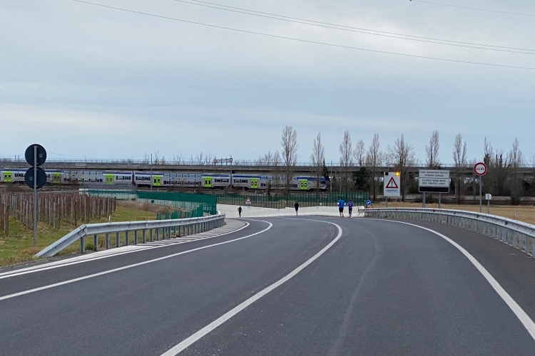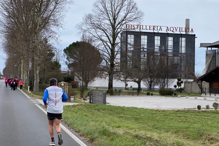 Die nächste größere Stadt, Cervignano, werden wir leider nicht durchqueren, sondern auf einer Umgehungsstraße umrunden. Auch diese Straße ist komplett gesperrt. Zuerst noch durch eine Unterführung, dann an einem riesigen Bahngelände entlang. „Interporto“ nennt sich das hier. Es handelt sich anscheinend um einen Verschiebebahnhof, treffen doch einige wichtige Strecken aus Österreich und Slowenien hier in Italien zusammen. Die unberührte Natur zwischen Bahngelände und Umgehungsstraße ist sicher ein perfekter Ort für die Tier- und Pflanzenwelt. Rechts hat man Ausblicke über die Felder. Oft wird Wein angebaut und die Weingüter werben auf Tafeln für ihre Produkte. Auch der Sponsor unseres „Marathonweins“ ist am Laufweg ansässig.