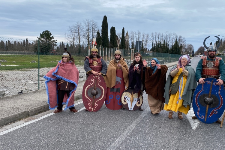 Hinter km 18 schwenken wir auf die alte Straße Richtung Aquileia. Jetzt gibt es wieder mehr zu sehen. Viele rosa gekleidete Damen wandern neben uns. Die Walking-Veranstaltung „Unesco in Rosa“ startete in Cervignano und führt 7,2 km nach Aquileia.