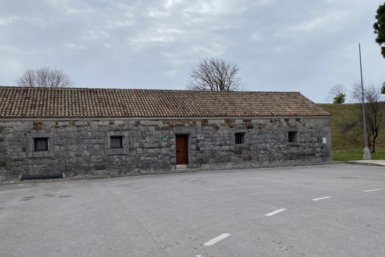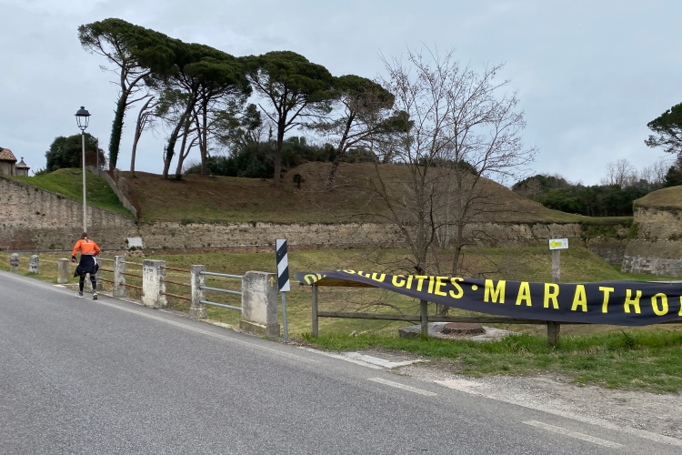 Die Kilometerschilder hat der Wind frühzeitig umgeworfen. Oft sind sie mit einem Träger Wasserflaschen beschwert. An einem heißen Tag sicher keine schlechte Idee. Wir kommen der Schotterstrecke näher. Ein Schild verbietet das Schwimmen im kleinen Kanal. Ich sehe ein Dreiergrüppchen weiter vor uns. Kurz danach erreichen wir das Aquileia-Tor von Palmanova. Leider steht das 42-km-Schild auf der anderen Seite der folgenden Kreuzung. Wir müssen also noch auf eine Schleife und sehen so ein paar Teilnehmer, die einen Kilometer vor uns sind. Es wird noch einmal interessant. Dem Infoheft im Starterbeutel habe ich entnommen, dass in den beiden alten Gebäuden am Rand der Stadt das Schießpulver aufbewahrt wurde. Auch ein altes Kasernengebäude gibt es zu sehen.