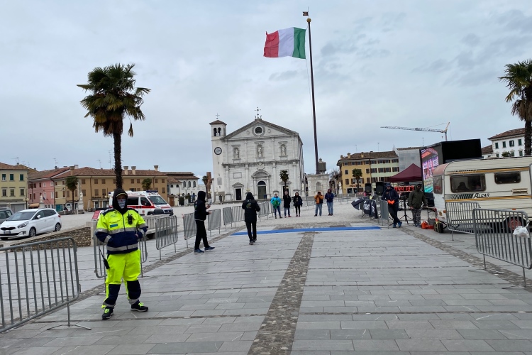 Auf einmal sehen wir Streckenposten des Protezione Civile vor Zufahrten zu Einfamilienhäusern. Keine wirklich gefährlichen Stellen, dennoch müssen die dick vermummten Gestalten hier sechs Stunden im kalten Wind ausharren. Ich rufe ihnen mein Dankeschön zu.