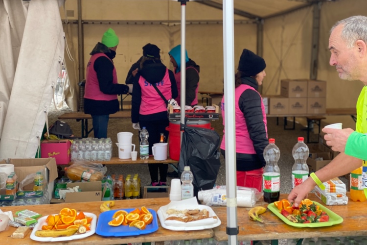 Die Zielverpflegung bietet italienische Erdbeeren an, dazu anderes Obst, Kekse und Getränke. Der Tee ist leider nur lauwarm. Ein Paar aus Berlin, das wir vom Marathon in Ravenna kennen, kommt ins Ziel; somit haben alle deutschen Teilnehmer den Lauf erfolgreich beendet.
