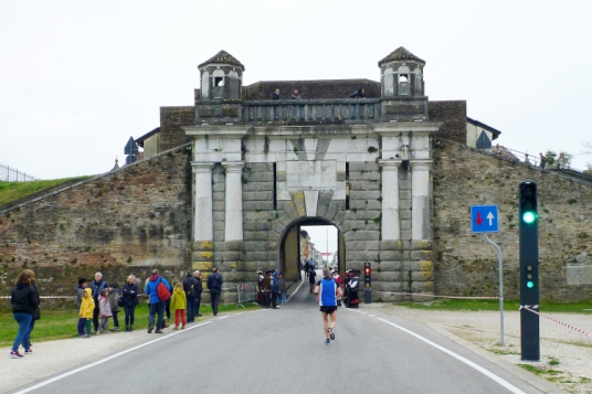 Durch die Porta Aquileia geht es wieder aus der Stadt. Der Übergang in eine mediterrane Landschaft fällt auf: Pappelalleen begleiten uns nun, die Luft fühlt sich weicher an. An der gesperrten Autobahnauffahrt vorbei geht es Richtung Ziel. Ich bin beeindruckt, dass die Straßen hier für uns vollständig autofrei gehalten werden. Nur ganz selten gelingt es einem PKW, auf die Laufstrecke zu kommen. Spätestens als die Vier-Stunden-Läufer uns langsam entschwinden, müssen wir einsehen, dass wir heute nicht mithalten können, und geben dem nun einsetzenden Gegenwind die Schuld.
