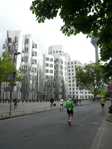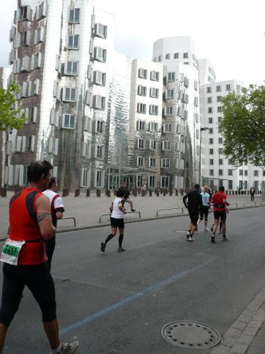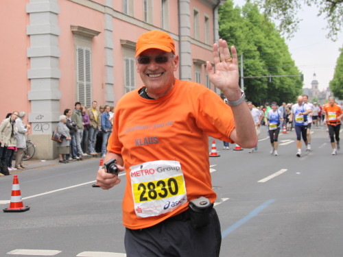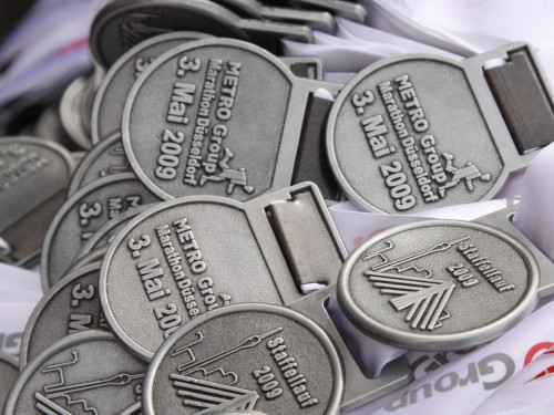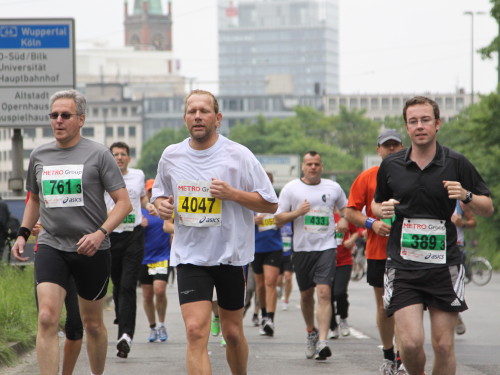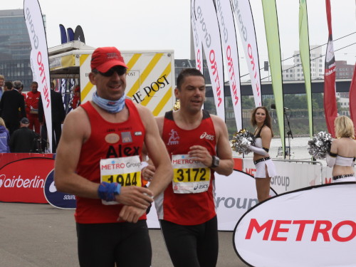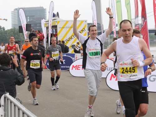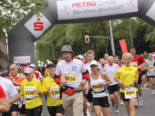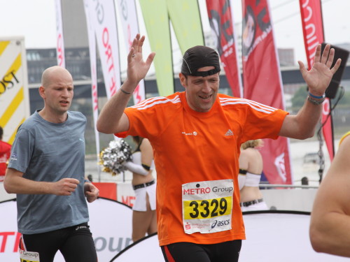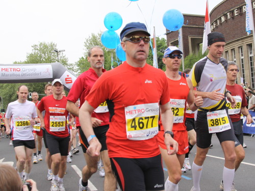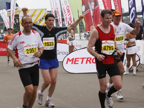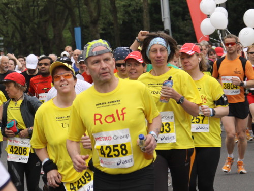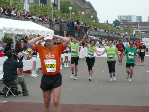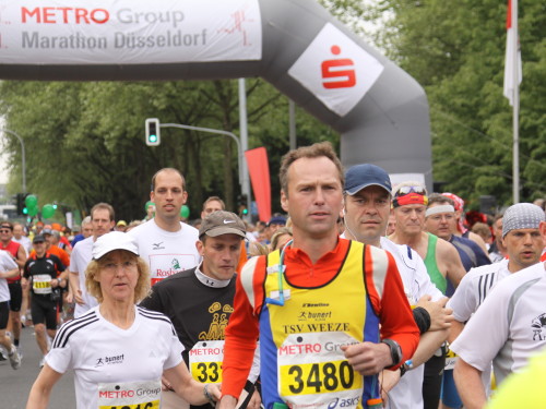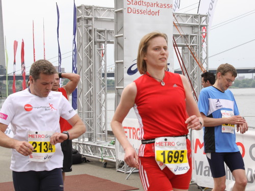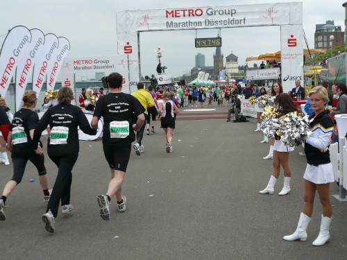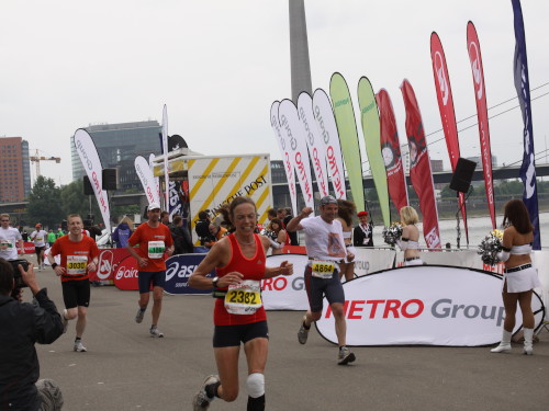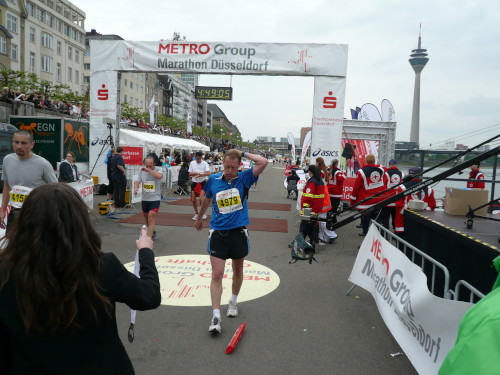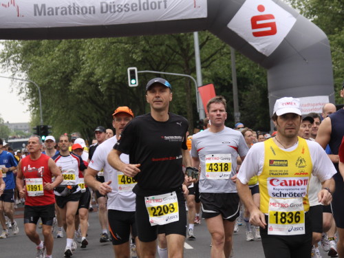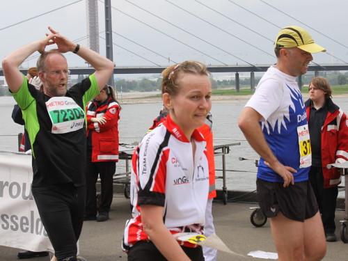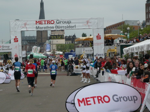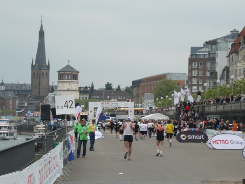 Ich genieße die letzten Meter, spüre kaum den Wind, der hier kräftig bläst und lasse mich beklatschen. Der Zieleinlauf ist wie der ganze Marathon, einfach klasse. Medaillengeschmückt geht’s in den Verpflegungsbereich. Und jetzt wird’s eng. Ist die Verpflegung so üppig, dass keiner mehr aus dem Zelt will? Irgendwann passt keiner mehr rein. Deshalb verzichte ich halt, hole meine Klamotten und versorge mich anderswo. Ich denke, da werden die Organisatoren nächstes Jahr etwas nachbessern, zumal sie ja weiter mit steigenden Teilnehmerzahlen rechnen. Zu recht. Düsseldorf ist eine Reise wert und der Marathon sollte in keiner Sammlung fehlen.