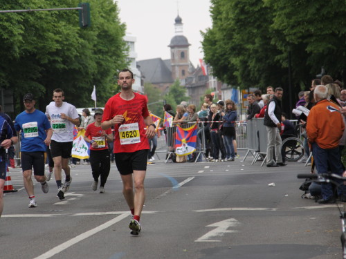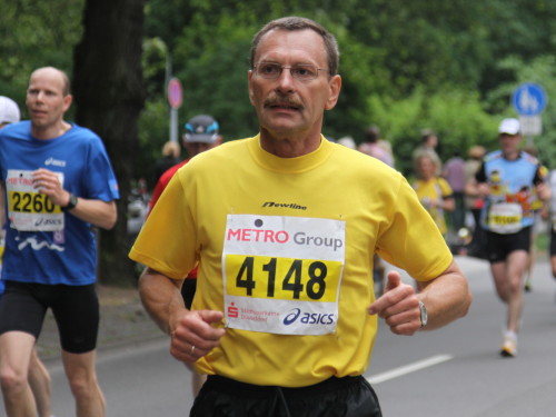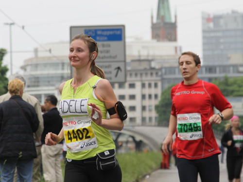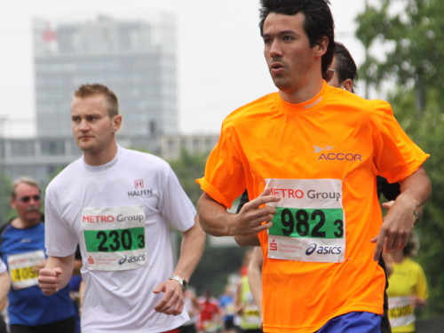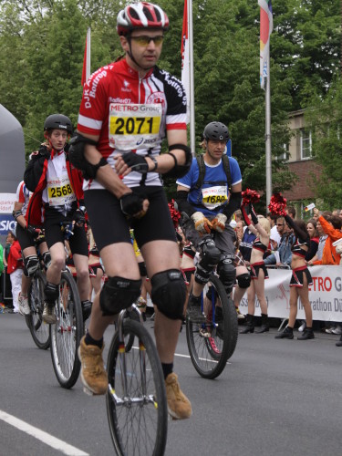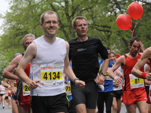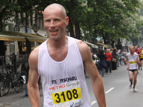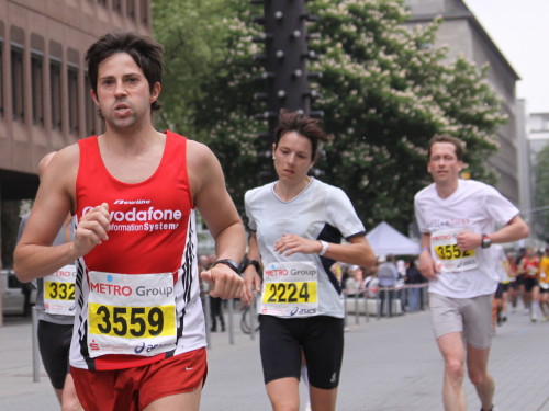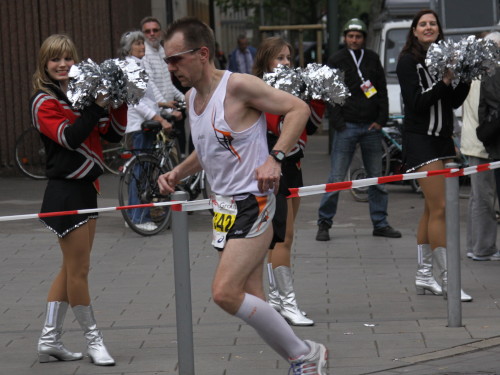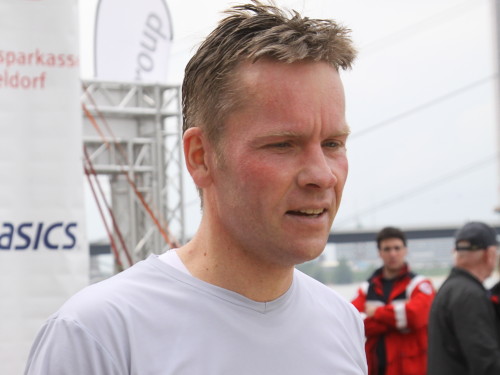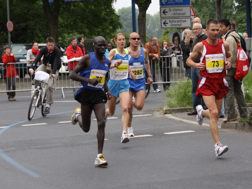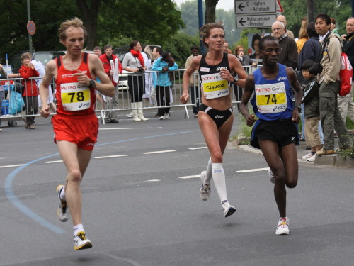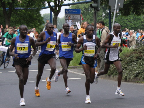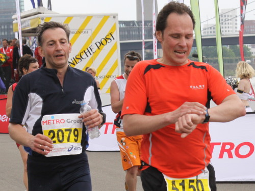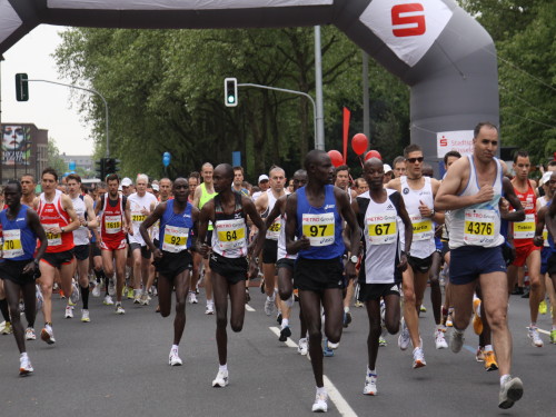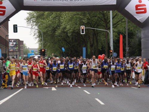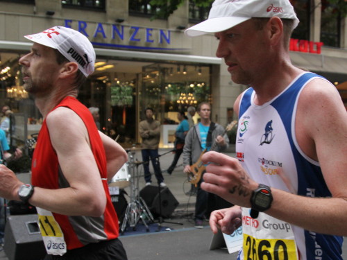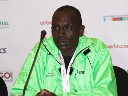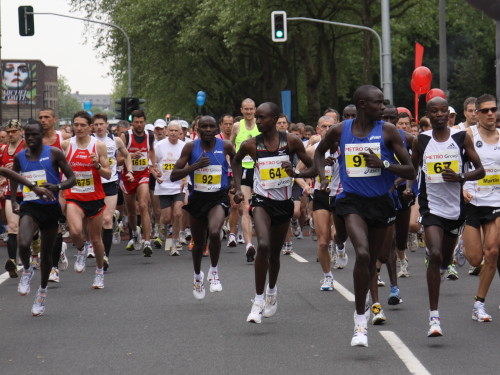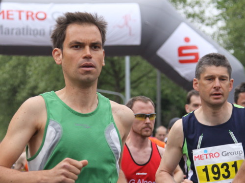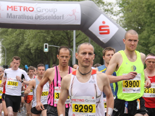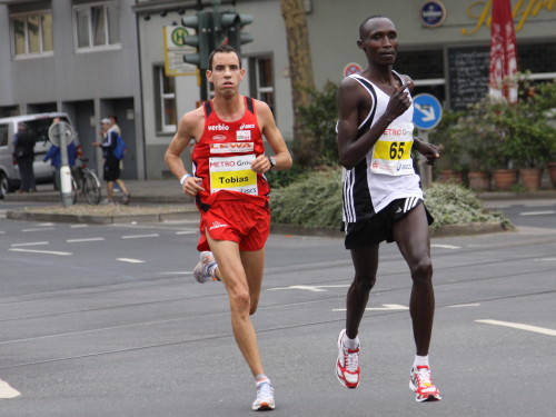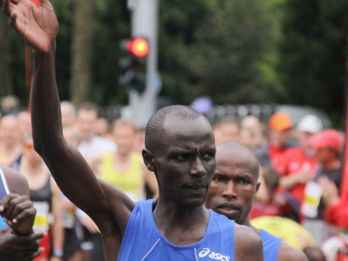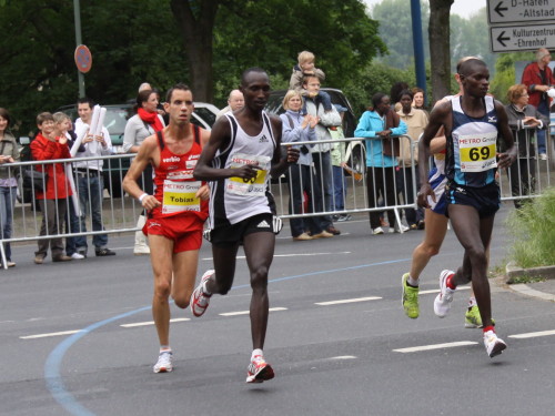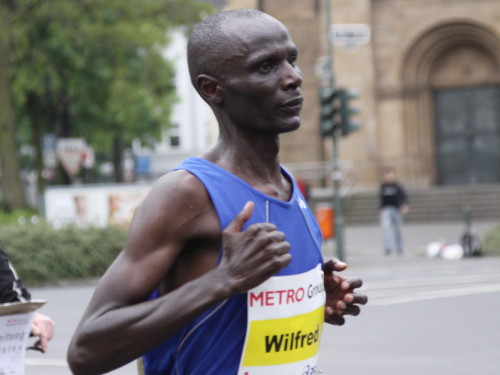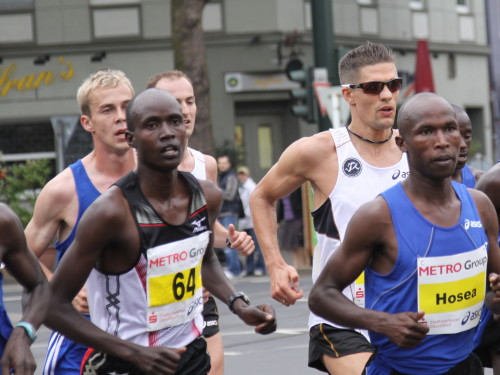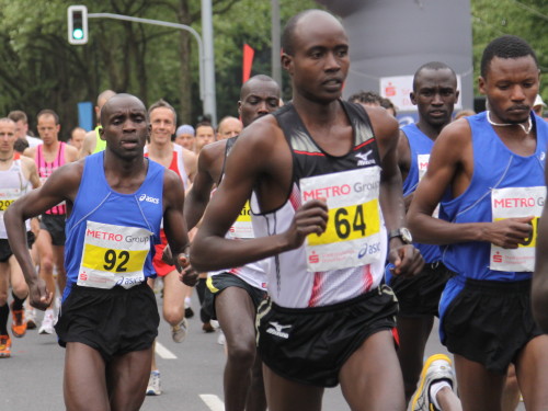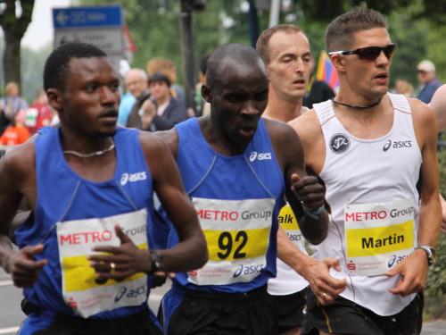 Und wie ging das Rennen an der Spitze aus? Wilfred Kigen wird Düsseldorf nicht so gut in Erinnerung behalten. Nach 35 km bekam er Probleme und konnte sein Tempo nicht mehr halten. Um vielleicht doch noch eine Zeit unter 2:10 zu erreichen, stieg sein Pacer David nicht aus sondern zog durch. Aber es reichte nicht ganz. 2:10:46 ist seine Siegerzeit.