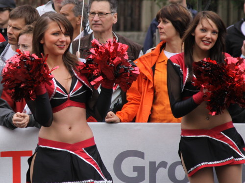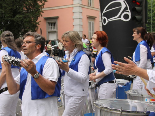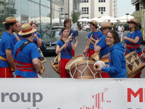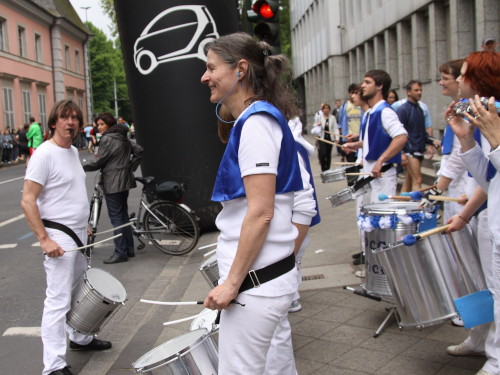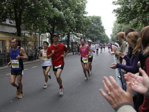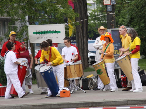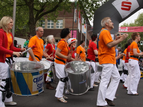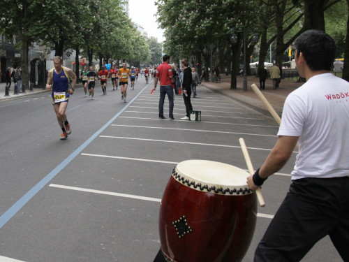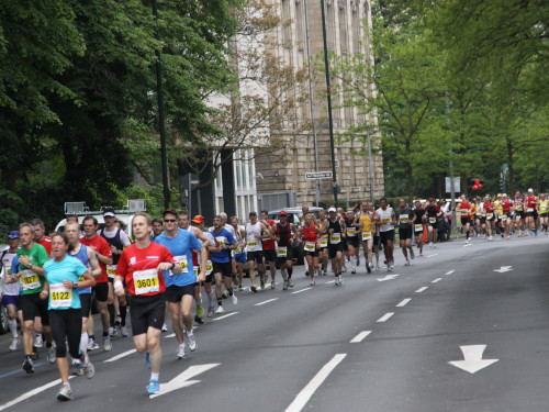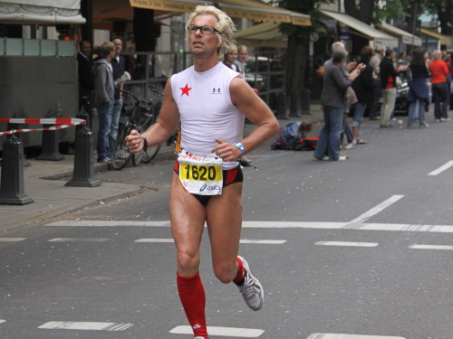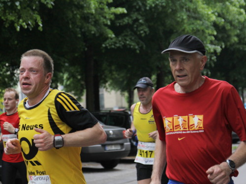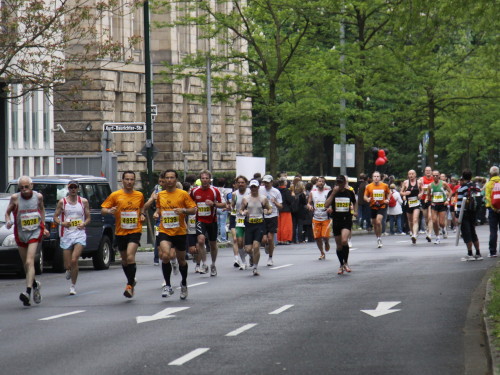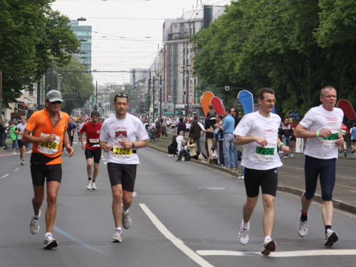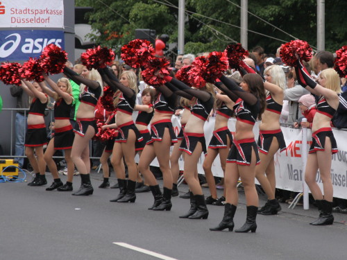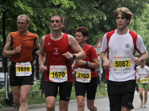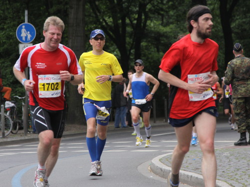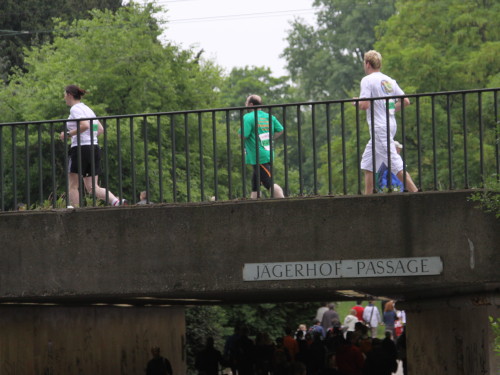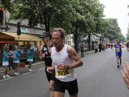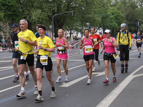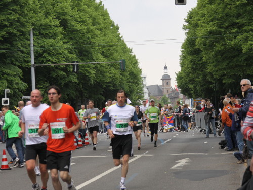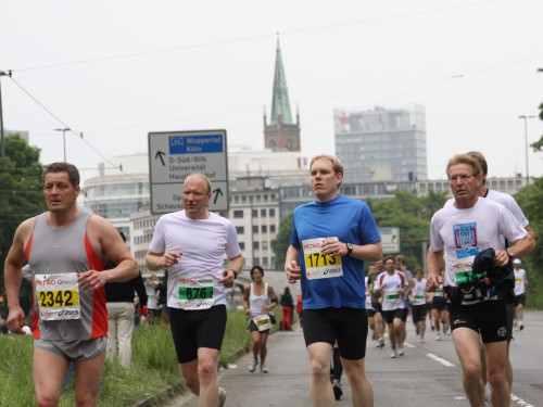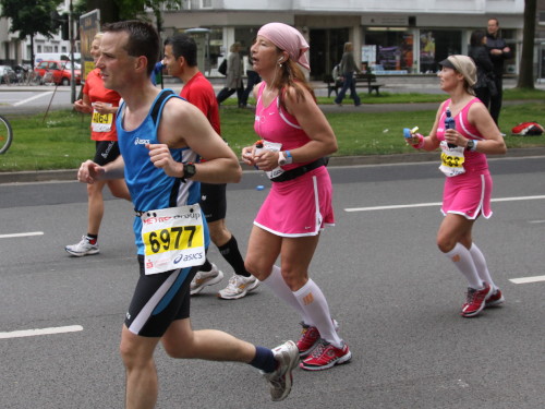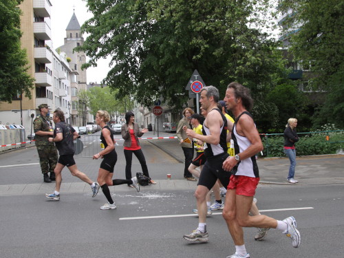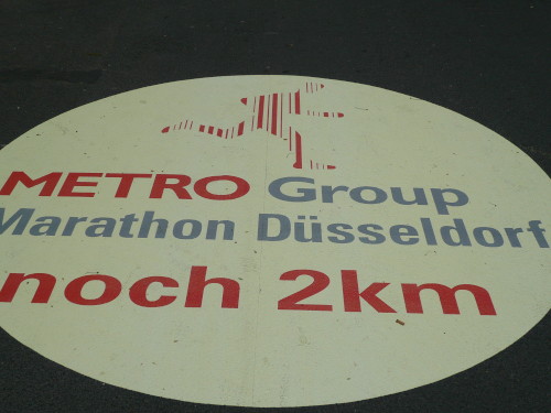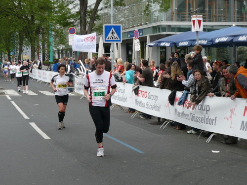 Für die Marathonis gibt es Wasser. Und guten Rat. Ein Helfer meint, man solle kaltes Wasser auf die schmerzenden Stellen tun. Aber wie soll ich in der kleinen Wanne ein Vollbad nehmen? Richtung Stadtmitte geht es weiter. Berliner Allee – statt rüber in die Kö geht es runter nach Unterbilk. Die Zuschauer kennen keine Gnade. „Ist heute Wandertag?“, muss sich ein krampfgeplagter Marathoni fragen lassen, gerade als ich ihn einhole und ihm Gesellschaft leisten will. Ich halte meinen Laufschritt bei. Der Trommler aber kann mich mal. Schneller geht nicht.