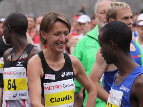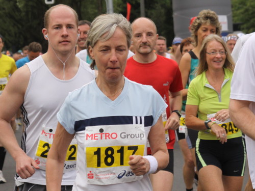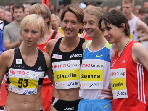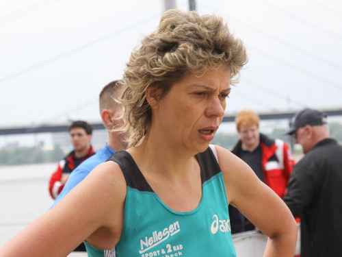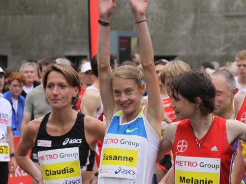 Überraschung bei den Frauen. Susanne Hahn gewinnt ebenfalls in neuer persönlicher Bestzeit (2:29:26). Claudia Dreher war nicht fit, probierte es trotzdem und musste nach 12 km raus. Auch Melanie Kraus schaffte es nicht ins Ziel, sie holte sich bereits beim Aufwärmen eine Zerrung. So wurde „Altmeisterin“ Sonja Oberem, die nur so „zum Spaß“ und aus Verbundenheit gelaufen ist, hinter Melanie Schulz aus Erfurt (2:42:47) Dritte in 2:43:49.