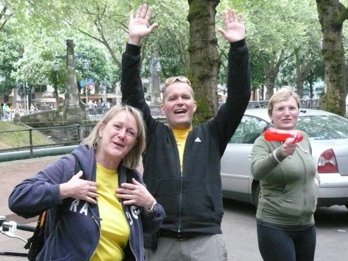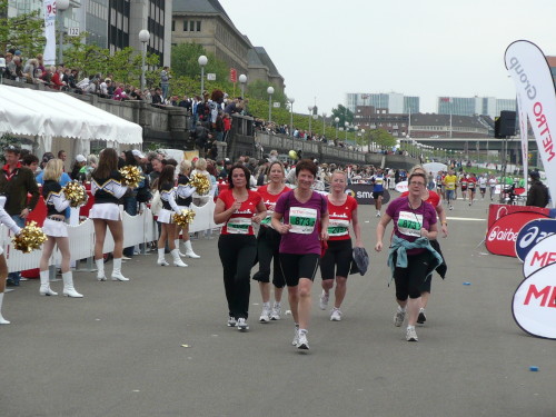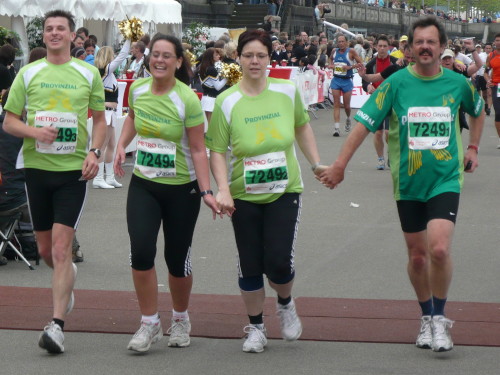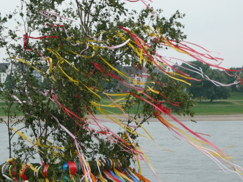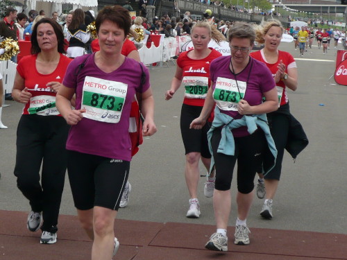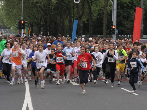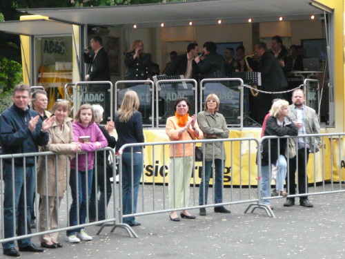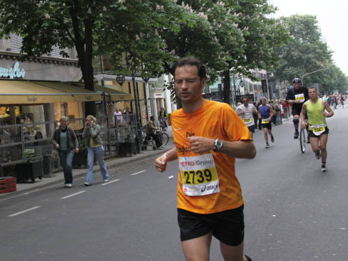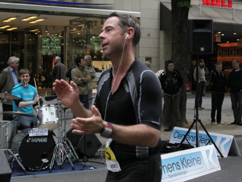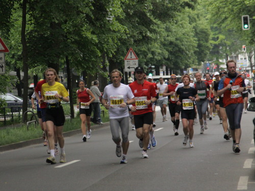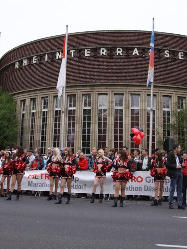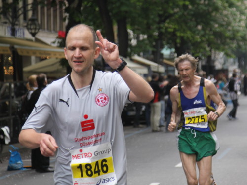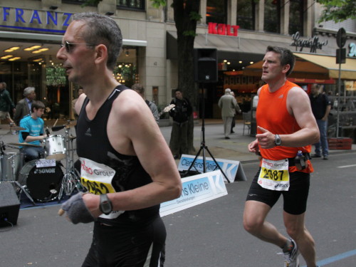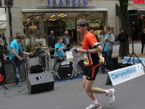 „Vier Kilometer, nur noch vier Kilometer“, singt das Quartett. „Wie weit ist es zur Kö?“ „Vier Kilometer, nur noch vier Kilometer“. Ich will zur Kö, von dort ist es nicht mehr weit. Das weiß ich noch. Als ich zum Haroldplatz (km 38.5) komme, sehe ich auf der Gegenbahn die Gruppe der 4:30-Läufer. Das war mein geheimes Ziel für heute. 3,695 Kilometer liege ich zurück. Die Muskeln brennen wie Feuer, und jetzt kommt das Schaulaufen auf der Kö. Dazu kommt auch noch ein Hustenanfall mit Brechreiz. Schon haben mich zwei Helfer im Visier. Hoffentlich geht das gut. Ich rette mich zur Getränkestelle, trinke zwei Becher Cola und trabe weiter. Zuschauer sind nicht mehr viele hier. Und die Cafés sind auch nicht gut besucht. Gestern war hier mehr los. Noch 2 Kilometer. Na also, geht doch. Meine Beine bewegen sich schneller. Der Joe-Cocker-Verschnitt auf der Showbühne macht’s. Noch einmal scharf rechts und ich bin am Rheinufer. Nichts anmerken lassen. Ich bin zwar langsam, aber das will ich so. Mir geht es gut. Dazu passt, dass ich stehen bleibe und fotografiere. Die Zuschauer sind begeistert.