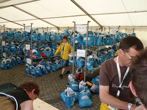 Ich gehe zu den Rheinterrassen und hole meinen Startbeutel ab. Im Startbeutel gibt es nochmal alle Infos für dieses Wochenende und die Startnummer. In der Startnummer ist der Zeitnahme-Chip von Chronotrack B-Tag integriert. Es ist ein Einmal-Ship, der anschließend mit der Nummer entsorgt werden kann. Wichtig ist für morgen, dass man über alle Zeitmatten läuft um auch registriert zu sein und die Strecke komplett gelaufen ist. Auf der Startnummer erkennt man auch seinen Startblock , z. B. blau (3:00 – 3:29 Std.), schwarz (3:30 – 3:59 Std.) usw.
