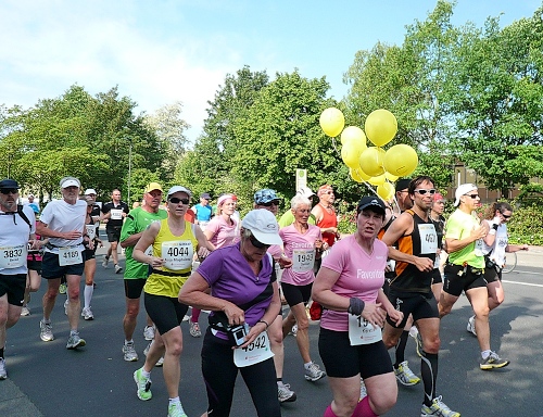 Es gibt heute Brems- und Zugläufer, die gut durch die farbigen Luftballons zu erkennen sind. Es wird Begleitung angeboten für die Zeiten 3 / 3,5 / 4 und 4,5 Stunden. Ich werde heute im grünen Block starten obwohl ich einen schwarzen Punkt habe. Man hört von vielen Läufern, dass sie auf Grund der zu erwartenden Hitze um die 30 Grad lieber langsamer laufen wollen.
