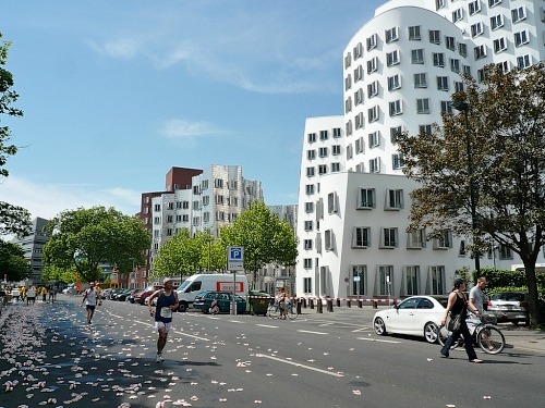Wir laufen über die Rethelstrasse vorbei am Düsseldorfer Zoo. Bei km 32 durchqueren wir wieder die Hofgartengrünanlage. Weiter geht’s über den Platz der Deutschen Einheit, Berliner- und Herzogstrasse. Wir unterqueren die Rheinkniebrücke und kommen in einer kurzen Schleife vorbei am Zollhof, dem Yachthafen und WDR.