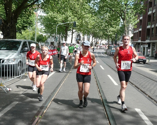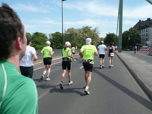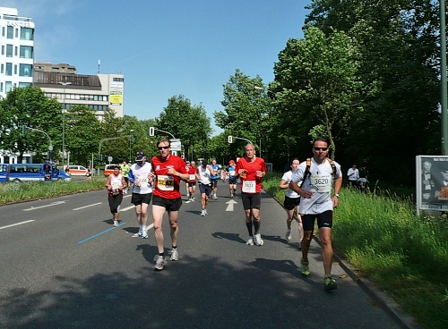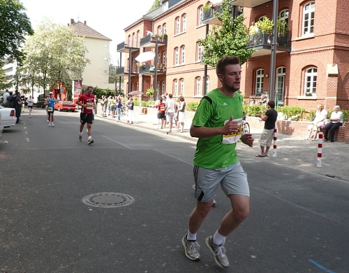 Bei km 5,5 sind wir wieder am Rheinpark und sehen diesmal nach rechts zum Wasser runter. Hier kommen uns ein Teil der später gestarteten Staffelläufer entgegen. Bei km 7 biegen wir ab und laufen über die Kaiserstrasse. Hier an der großen Grünanlage Hofgarten befindet sich die erste Wechselstation der Staffelläufer. Damit es kein Gedränge zwischen Marathonläufer und Staffelläufer gibt, werden über eine Marathonweiche die Staffelläufer in einen Extrakanal rechts der Straßenbahninsel geleitet und die Marathonläufer passieren die Stelle links der Straßenbahninsel. Eine sehr gute Lösung, denn von anderen Veranstaltungen kenne ich an solchen Stellen nur Chaos. Diese Wechselstationen sind schon wie ein kleines Fest, so viele Menschen sind hier. Kein Wunder bei fast 3.000 gemeldeten Staffeln.