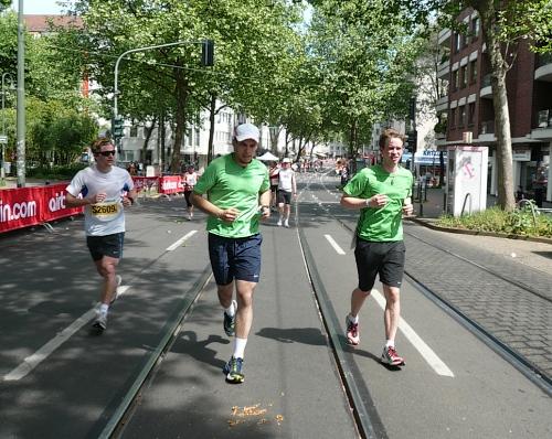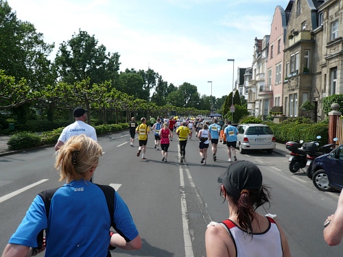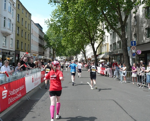 Wir laufen durch wunderschöne Wohngegenden, viele Menschen sind am Straßenrand. Vor den Kneipen gibt es Biertische, die heute stark genutzt werden und viel Applaus für die Läufer. Es gibt kaum Plätze, wo man mal alleine ohne Zuschauer läuft. Die Düsseldorfer sind wirklich Klasse.