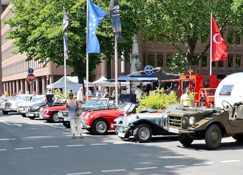 Hinter der Brücke kommen wir am Innenministerium vorbei. Jetzt sehen wir schon viele Läufer, die auf dem letzten Kilometer sind. Wir haben noch 3,5km vor uns. Es geht jetzt bis zur Königsallee. Knapp einen Kilometer lang erstreckt sich die Königsallee von Süd nach Nord. In der Mitte der Kö, wie sie genannt wird, befindet sich der 32 Meter lange Stadtgraben in dem noch echtes Düsselwasser fließt. Gesäumt wird dieser Boulevard von 120 Kastanienbäumen. Auf der Ostseite der Kö sind die weltweit bekanntesten und teuersten Modelabels vertreten. Wer hierher kommt, kommt wegen der Mode, denn diese Straße zählt zu den Modezentren der Welt.