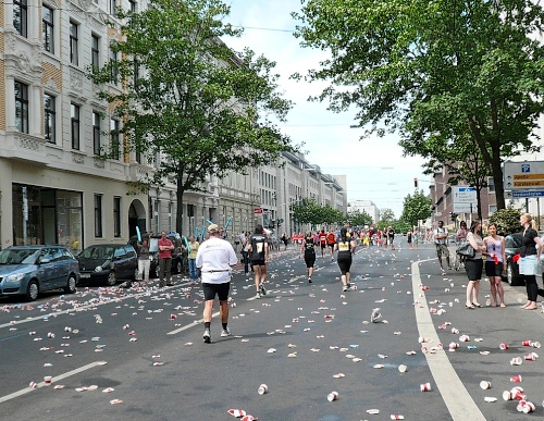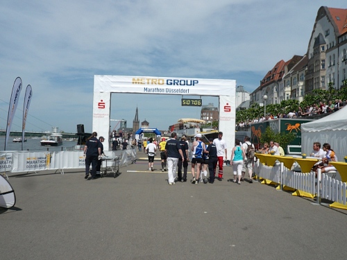 Ins Ziel kommen heute 2.597 Marathonis und 1.860 Staffeln. Für viele haben die hohen Temperaturen und ein teilweise starker Wind die Hoffnungen auf Bestzeiten zunichte gemacht. Auch vielen Eliteläufer war es heute zu heiß und sie stiegen frühzeitig aus. Jan Fitschen rette sich mit 2:20:15 als 8. ins Ziel. Österreichs Rekordhalter Günther Weidlinger erging es viel schlechter. Nach seinem zweiten Kollaps musste er bei km 25 das Rennen aufgeben. Für den Veranstalter vom Metro Group Marathon war es ein großer Erfolg, denn insgesamt haben sich an den verschiedenen Wettbewerben rund 14.000 Läufer beteiligt.