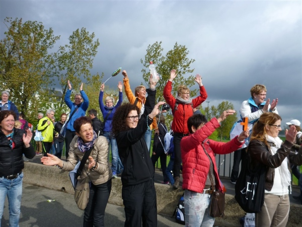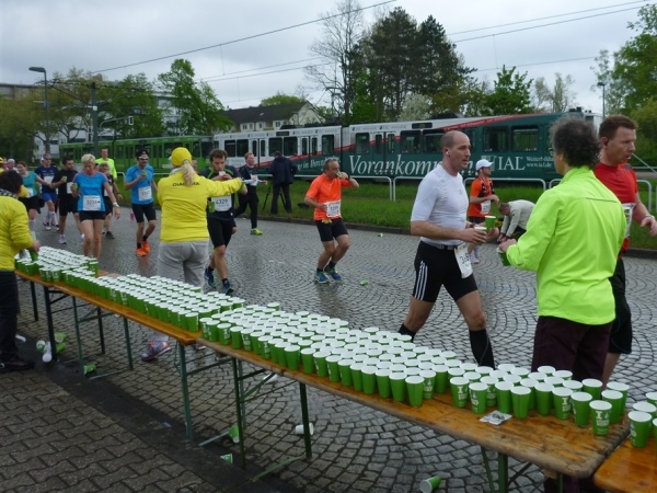 Die Runde ist geschlossen, auf dem 6. km sind wir wieder auf dem Rückweg in Richtung Start und können sogar noch einige Nachzügler bewundern. Vorher hat man uns erstmals mit Wasser versorgt, alle 2,5 km erwartet uns jetzt eine Tränke, verdursten braucht also keiner. Eine weitere Sambagruppe macht uns Beine und freut sich über mein Feedback in Form meiner Kameralinse. „42 km Emotionen“ verspricht uns das großformatige Werbeplakat, das man an verschiedenen Stellen der Stadt plaziert hat. Ob das wirklich so sein wird, werden wir auf den noch ausstehenden 35 km zur Genüge prüfen können, letztlich ist es aber doch meist die eigene hoffentlich positive Einstellung, die am Ende darüber entscheidet, ob ein Marathon toll war. Auf dem achten km drehen wir eine Schleife zur Rampe der Oberkasseler Brücke und nehmen die ersten von heute wirklich nicht nennenswerten insgesamt 36 Höhenmetern.