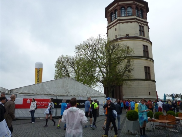 Natürlich lasse ich weder das letzte erhaltene Teil des ehem. Düsseldorfer Schlosses, den Schlossturm, noch die große Freitreppe und schon gar nicht den Burgplatz aus, denn hier mündet die 40 km lange namensgebende Düssel in den Rhein. Ja klar, warum sonst hieße es Düssel-Dorf? Ich unterquere die Oberkasseler Brücke, die wir später auf dem 10. und 18. km eine Etage höher überqueren werden. Und schon bin ich im Startbereich angekommen und habe noch vor dem ersten Laufschritt mehr Attraktives als bei so manchem anderen Stadtmarathon insgesamt erspechtet.