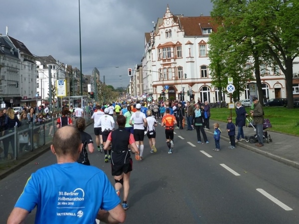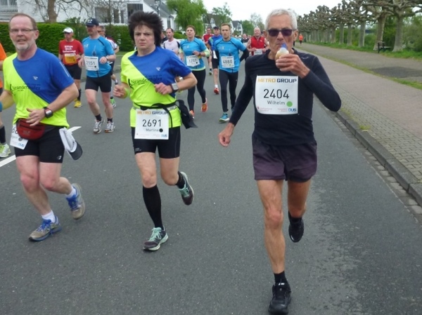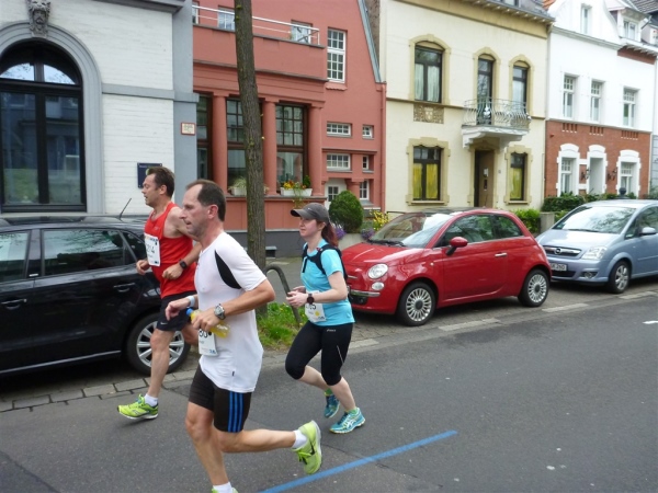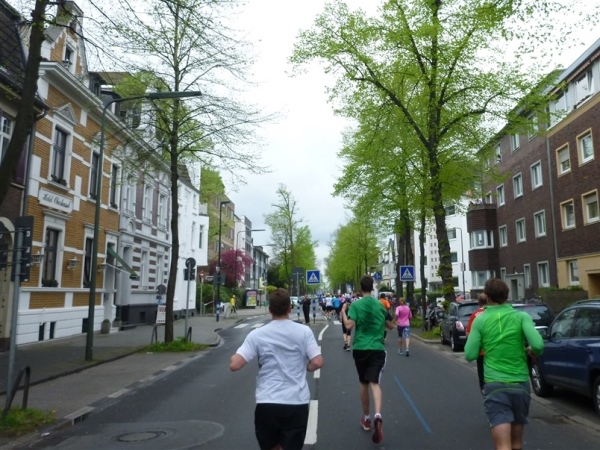 Die ersten drei km führen, zunächst mit Unterstützung gut verpackter, sich einen abpuschelnder Cheerleader am Rheinufer entlang Richtung Norden, was mich direkt an den Bonner Silvesterlauf erinnert. Auch nach vielen Läufen renne ich immer noch zu schnell an, bin mit keinen 17 min. deutlich zu flott für meine anvisierten 4:15 Std., sogar die 3:45 Std.-Ballons habe ich noch hinter mir. Es gibt viel zu entdecken, das beeindruckende Gebäude des Oberlandesgerichts ist wirklich nett anzusehen. „Schreibst Du heute den Bericht?“, fragt mich Henry Hillmann, und wird, da er sich kompetent zeigt, direkt abgelichtet, bevor er in Richtung 3:36 enteilt.