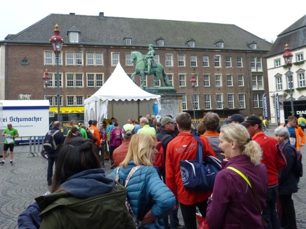 Nach den monumentalen Verwaltungsgebäuden des ehem. Mannesmann-Konzerns präsentiert sich mir die heutzutage verkehrsfreie Rheinuferpromenade mit der Pegeluhr, die den aktuellen Wasserstand des Rheins sowie die Uhrzeit anzeigt und noch aus der Zeit der ersten Promenadengestaltung zu Beginn des 20. Jahrhunderts stammt. Dem schließt sich der 1392 erstmals erwähnte Marktplatz als Düsseldorfs zentraler Platz im Herzen der Altstadt an. Hier erfolgt heute die Startnummernausgabe in einem kleinen Zelt, was mir die willkommene Gelegenheit eröffnet, mich auch an dieser Stelle noch ein wenig umzuschauen ohne mich müde zu machen.