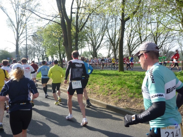 Tatsächlich sind die Absperrgitter im Startbereich eines Stadtmarathons für mich immer ein Greuel, ganz schlimm war es in Rom, wo man wie Vieh, auf dem Weg zur Sterilisation durch die 2 Meter hohen Gitter getrieben wurde. Hier geht es. Ich finde noch nach dem Startschuss schnell einen Durchlass, kann auch ohne drohend-glühendes Eisen die ersten Kilometer schnell absolvieren, obwohl ich erst seit 30 Minuten in dieser Stadt bin und keine Zeit für ein Frühstück hatte.