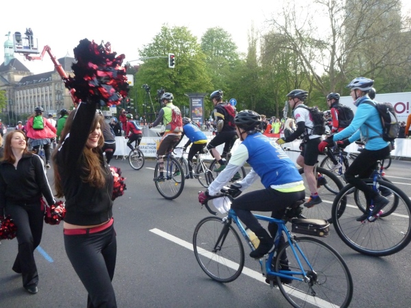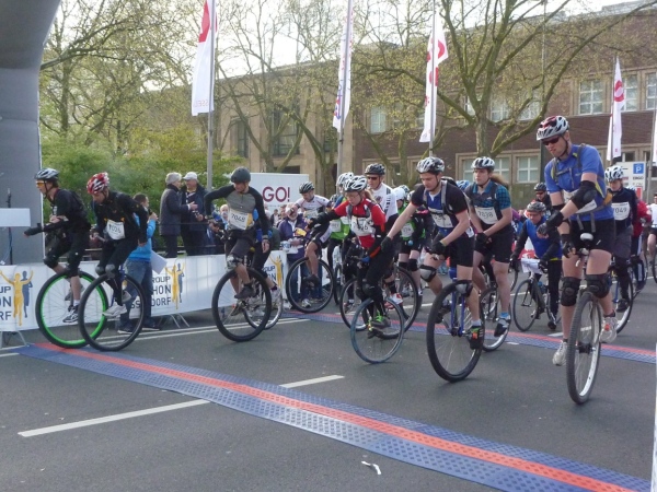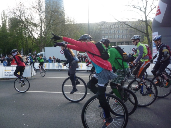 Die Bürgermeisterin von Düsseldorf hat so viele Binde-Striche-Im-Namen, dass eine Namensnennung diesen Bericht sprengen würde. Allerdings hat die 45jährige wohl deswegen keine Bindegewebsschwäche, denn sie klettert souverän über das Absperrgitter auf die Tribüne (sehr riskant!), um den Startschuss zu geben.