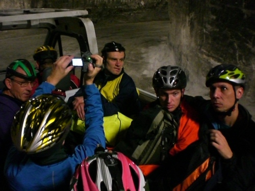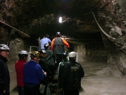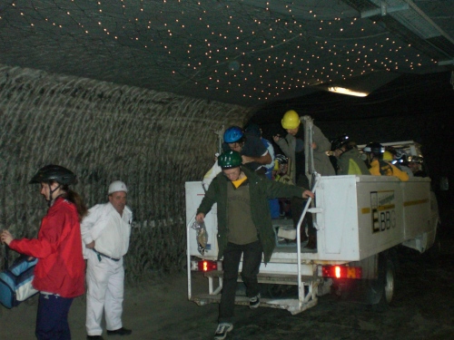 Für den Transfer zum Startgelände warten auf uns bereits Grubentransporter. Auf der großen, offenen Ladepritsche mit drei langen, gepolsterten Bankreihen haben knapp 25 Leute Platz. Auch hier wird es eng. Aber, wie ich schnell feststellen darf: Das ist gut so. Denn keine halbe Minute später rasen wir in einem Irrsinnstempo durch das unterirdische Stollenlabyrinth. Die Felswände neben und über mir fliegen nur so vorbei, es geht urplötzlich nach links und nach rechts, hinauf und hinab. Man kann kaum vorhersehen, wo es in der nächsten Sekunde weitergeht. Ich setze mein ganzes Gottvertrauen in den Fahrer und denke mir nur: Der wird schon wissen, wie er hier fahren kann und wohin er fahren muss. Ich komme mir vor wie in einer Rohrpost, die auf verschlungenen Wegen durch ein Leitungssystem gejagt wird. Der Weg und die Zeit vergehen wie im Rausch. Im Nachhinein habe ich keine Vorstellung, wie lange wir unterwegs waren, es werden wohl nur ein paar Minuten gewesen sein. Jedenfalls: Auf einmal stoppt der Wagen. Leicht benommen – oder positiver ausgedrückt: berauscht – steigen wir vom Wagen. Was mir sofort sehr angenehm auffällt: Hier ist es mit etwa 22 Grad C deutlich kühler als am Aufzugausgang.