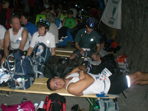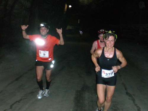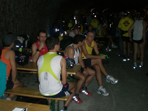 Halbzeit. Die Vorstellung, dieselbe wie die zurück gelegte Distanz noch mal zurück legen zu dürfen, löst in mir gespaltete Gefühle aus. Einerseits genieße ich das besondere Erlebnis, die Stimmung, den eigenwilligen „Flair“ hier unten, andererseits fühle ich in besonderer Weise, wie meine physischen Energien schwinden. Deutlich mehr als bei anderen Läufen, auch etwa Bergläufen an der frischen Luft, merke ich, wie der verlorene Schweiß die Kraft raubt, ein Verlust, der auch durch häufiges Trinken letztlich nicht zu kompensieren ist. Und wenn es so etwas wie einen (kleinen) Kritikpunkt an dieser Veranstaltung gibt, dann ist es der, dass nichts zum Ausgleich des Mineral- und Salzverlusts vorgehalten wird, idealerweise so etwas wie eine Bouillon.
