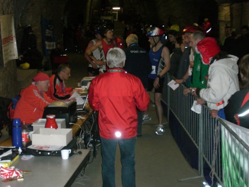 Die Grubentransporter karren immer mehr Leute heran. Langsam füllen sich die Stollen, wird es lauter, bunter, trubeliger, aber nie hektisch oder beengt. Für zusätzliche Stimmung sorgt eine Grubenkapelle in Tracht, unterbrochen von den Ansagen eines Moderators. Ich ruhe mich aus, entschließe mich zu einem zweiten Frühstück und freue mich, mit Wolfgang Bernath und Eberhard Ostertag von marathon4you mir bekannte Gesichter zu treffen.