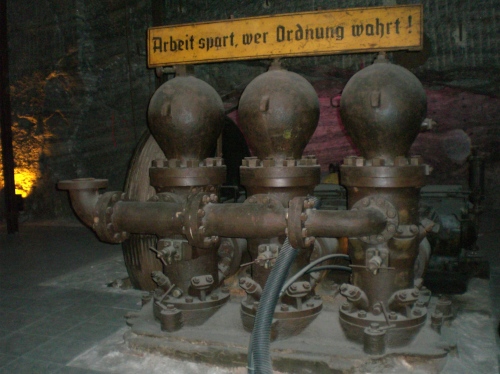 Gleichmäßig und ruhiger als gedacht geht es hinab, 700 Meter weit, etwa vier (geschätzte) Minuten lang. Ab und an lässt ein von irgendwoher flackerndes Licht einen kurzen Blick auf die nackte Wand der Aufzugröhre erhaschen. Die Spannung löst sich ein wenig, Lachen ertönt. Schnell wird es wärmer. Ein weiterer Ruck: Wir sind angekommen. Scheppernd wird der Vorhang hochzugezogen. Und als erstes empfängt mich eine Hitzewand. Oh je, denke ich mir nur. Anno 2003 beim Hitzemarathon in Wien hatte ich mir geschworen, Marathon nie wieder bei Wärme zu laufen. Und jetzt bin ich hier und tue mir wieder so etwas an, und das sogar vorsätzlich ..... Gleichzeitig fällt mein Blick auf den hell erleuchteten, hier viele Meter breiten und hohen Stollen mit seinen furchigen und doch insgesamt sanft gerundeten Wänden und dem hellen, vom Salz mattglitzernden Gestein. Richtig großzügig wirkt der Raum, alles andere als beklemmend. Auch wenn es heiß ist: Die Luft ist hervorragend, alles andere als stickig. Schnell schlägt der erste Schrecken in Faszination um.