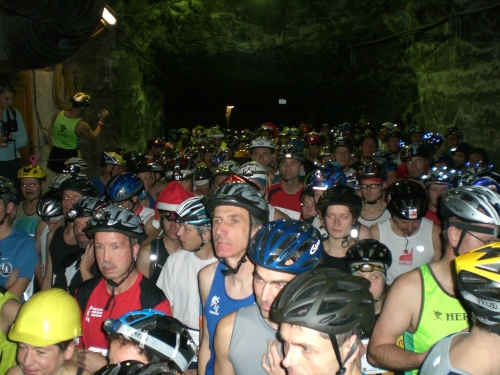 Eine Viertelstunde später ist es aber soweit. Wir werden gebeten, hinter dem „Start“-Banner, Aufstellung zu nehmen. Einen fast schon bizarren Anblick bietet das dichte, den Stollen in voller Breite und weit in die Tiefe ausfüllende Läuferband. Alle sind temperaturangemessen leicht gekleidet, tragen aber den verpflichtenden Helm auf dem Kopf, die meisten auch eine Stirnlampe.