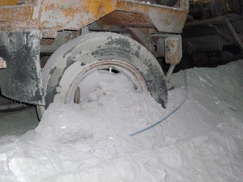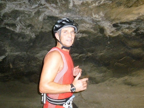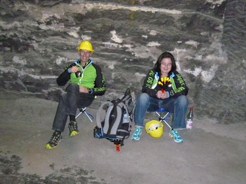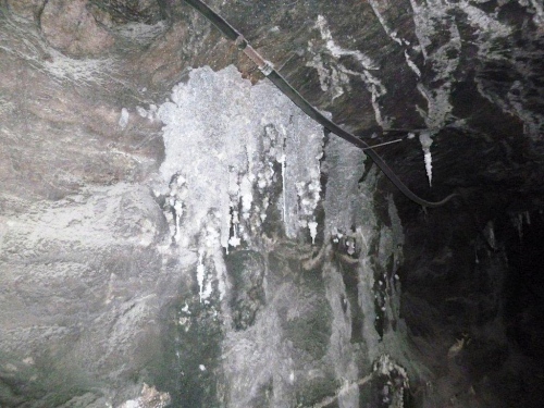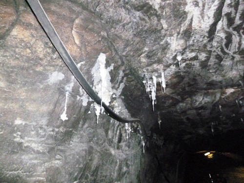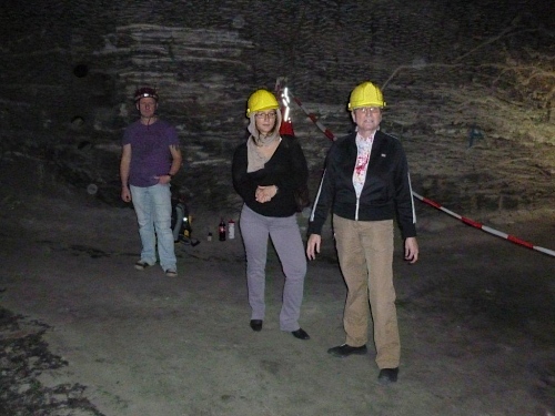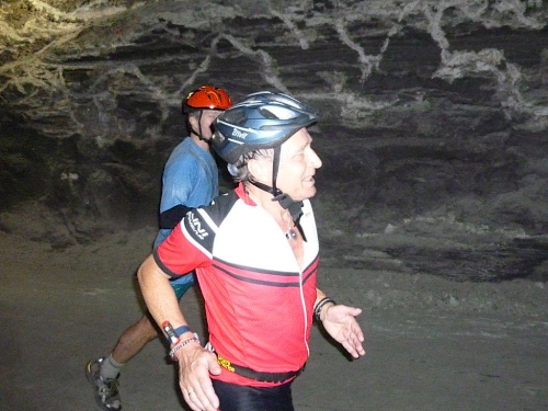 Ein Stück vom Start entfernt wirkt die Wärme der Tiefe in den Stollen im vollen Ausmaß, was sich unter dem Fahrradhelm besonders bemerkbar macht. Der Schweiß kommt jedoch nicht dazu, in die Augen zu rinnen. Er verdunstet zuvor in der Trockenheit untertage. Ich lecke die Lippen und spüre Enttäuschung – darüber, dass ich nicht Salz spüre. Zudem ist der Sand und Staub unter den Füßen leicht pappig, das blanke Salzgestein darunter dafür rutschiger. Ich vermute, dass der Boden befeuchtet wurde, um den Fahrzeugen eine bessere Haftung zu ermöglichen – und vielleicht auch, um die Staubkonzentration in der Luft zu minimieren.
