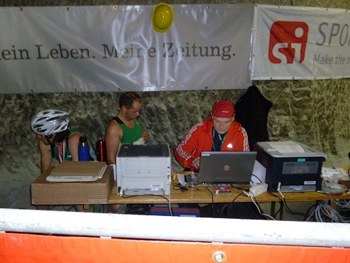 Nach der ersten Runde gibt ein Blick auf die Leinwand im Start-und Zielbereich das Zeitgefühl für einen Moment zurück. Die gemessene Durchgangszeit und die noch verbleibenden Runden werden vom Zeitmesssystem darauf projiziert und geben Auskunft über die Verlässlichkeit des Gefühls.