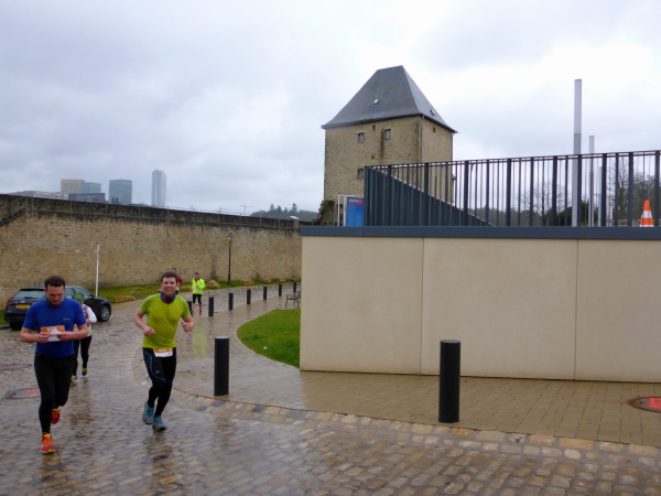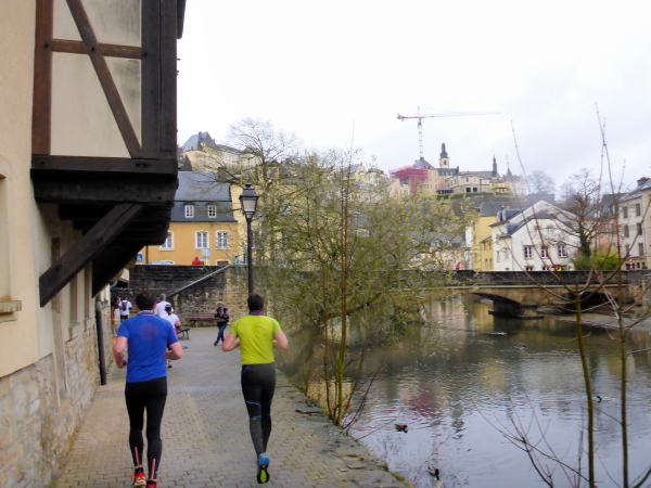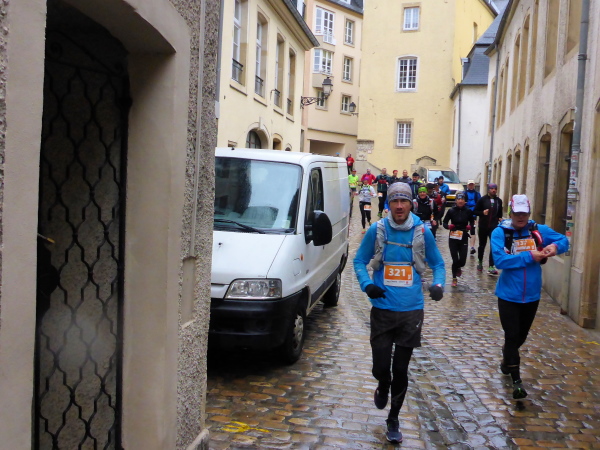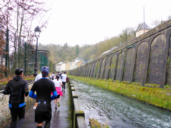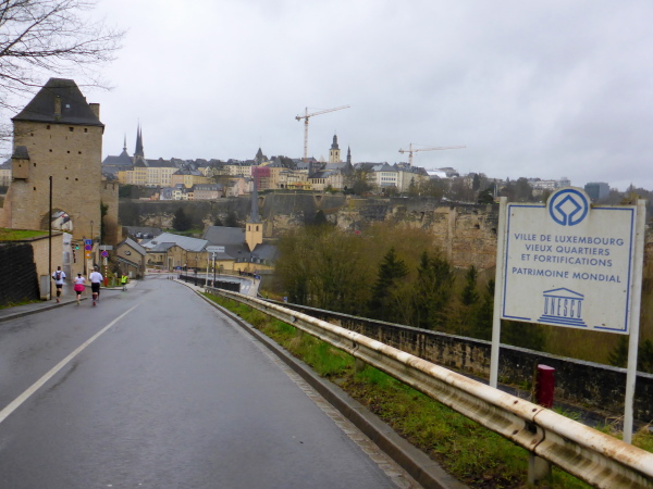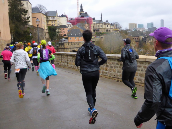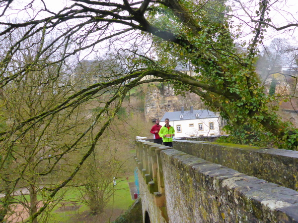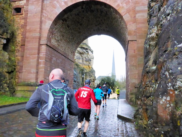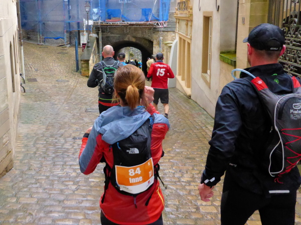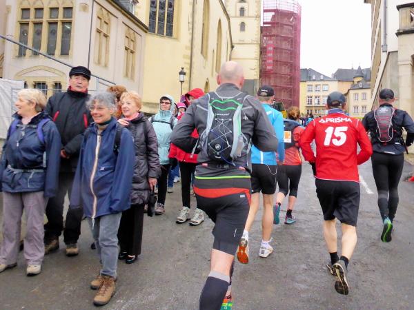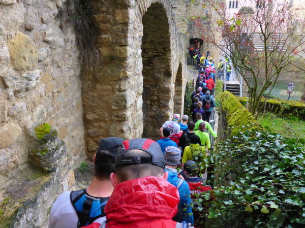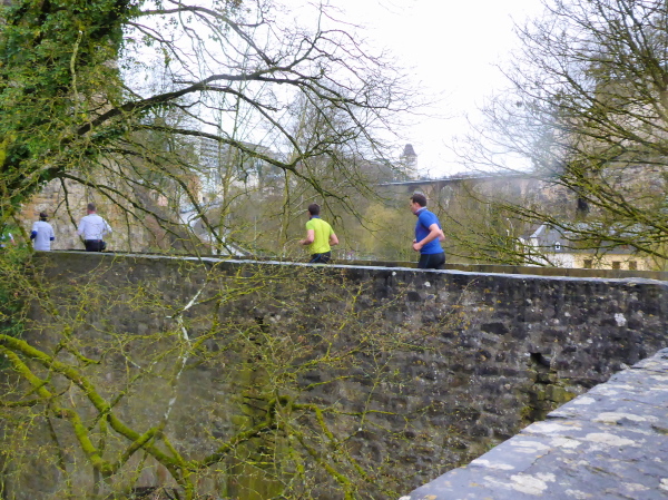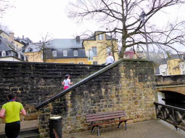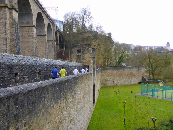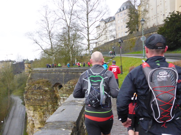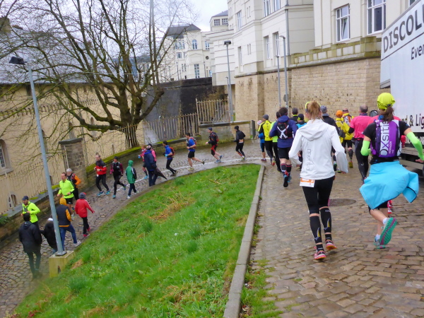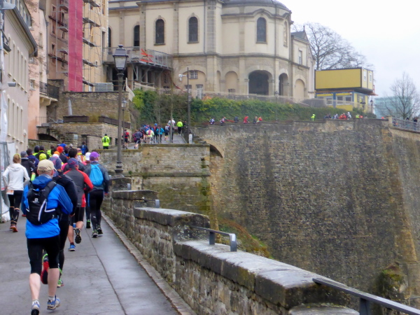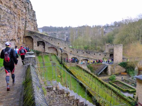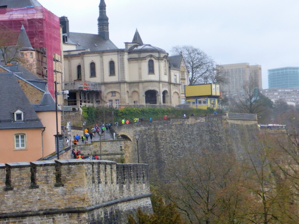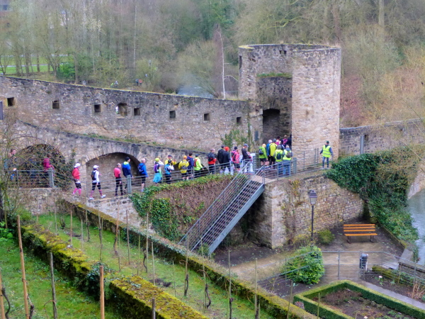 In der Rue de l´eau, (auf Lux komischerweise Nikolausstraße) ist die Konditorei von Lea Linster, die mir nur deshalb ein Begriff ist, weil Kollegin Birgit letztes Jahr bei dem Anblick der Starköchin extrem hyperventilierte. Ist bei mir nicht der Fall, zumal es wunderbar läuft. Bei den vielen Aussichten hinab, hinauf und auf die alten Mauern komme ich nicht außer Atem, ich muss einfach stehenbleiben und fotografieren, um das ganze Ausmaß der Läuferkolonne zu erfassen, wie sie sich über schmale Mäuerchen und durch enge Wege schlängelt.