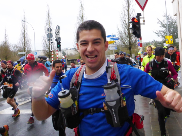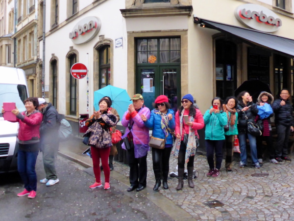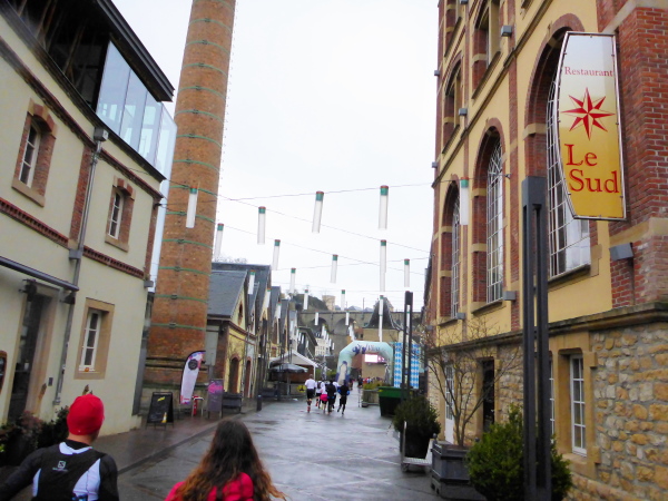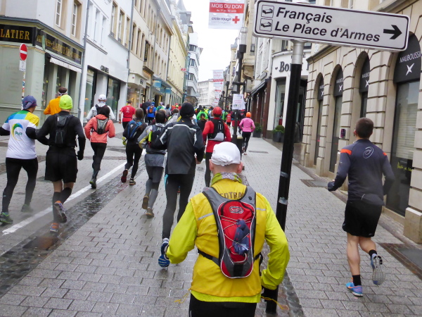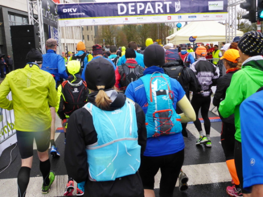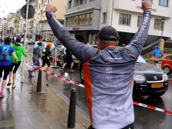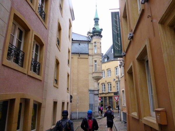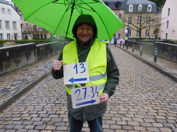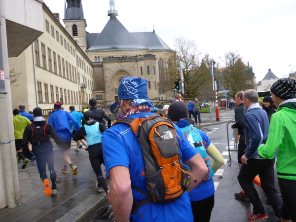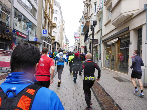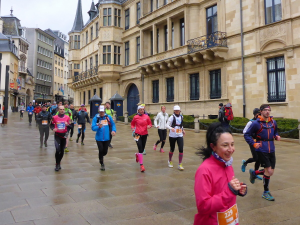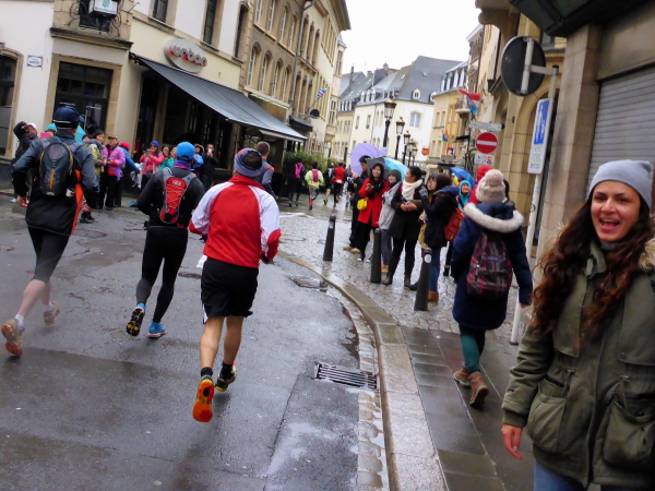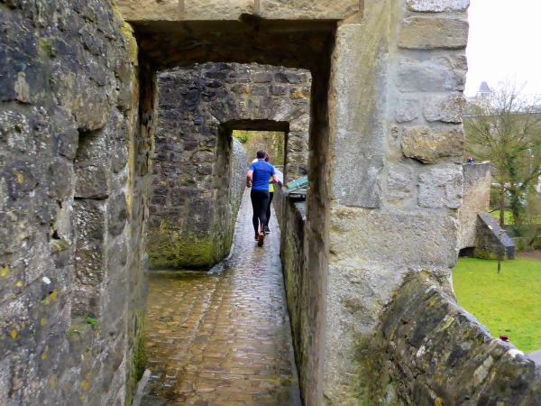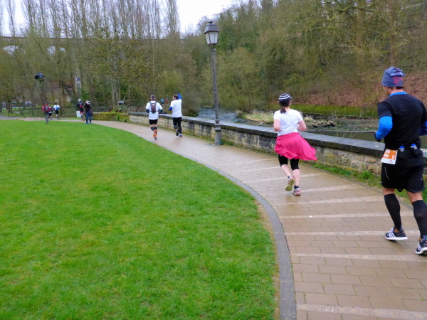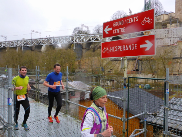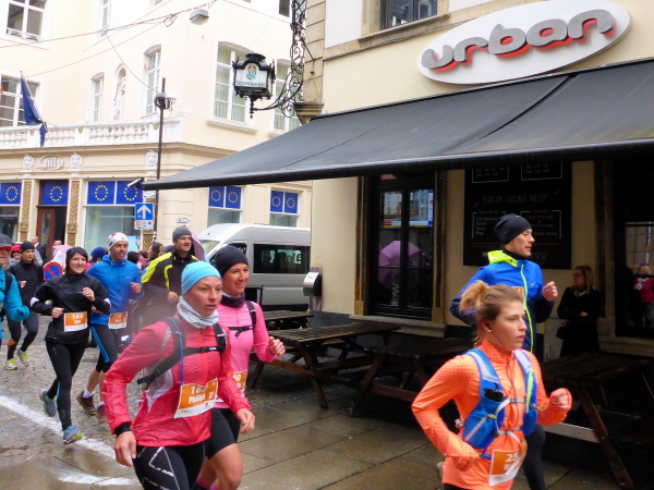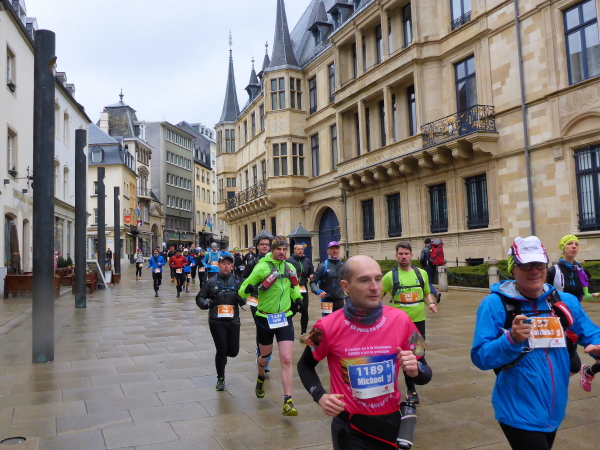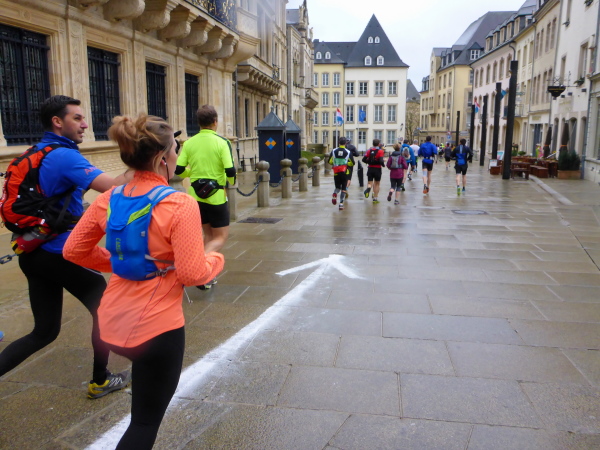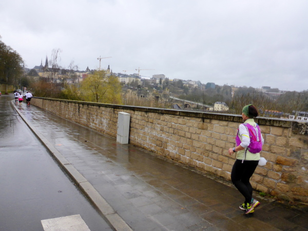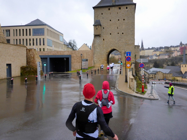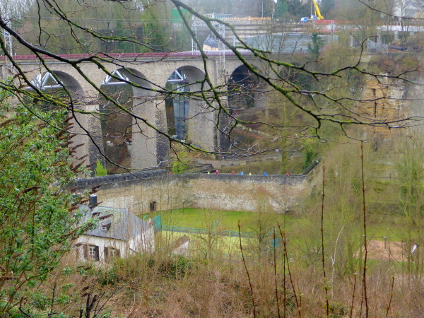 In der Rue de l´eau, (auf Lux komischerweise Nikolausstraße) ist die Konditorei von Lea Linster, die mir nur deshalb ein Begriff ist, weil Kollegin Birgit letztes Jahr bei dem Anblick der Starköchin extrem hyperventilierte. Ist bei mir nicht der Fall, zumal es wunderbar läuft. Bei den vielen Aussichten hinab, hinauf und auf die alten Mauern komme ich nicht außer Atem, ich muss einfach stehenbleiben und fotografieren, um das ganze Ausmaß der Läuferkolonne zu erfassen, wie sie sich über schmale Mäuerchen und durch enge Wege schlängelt.