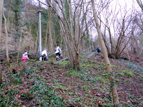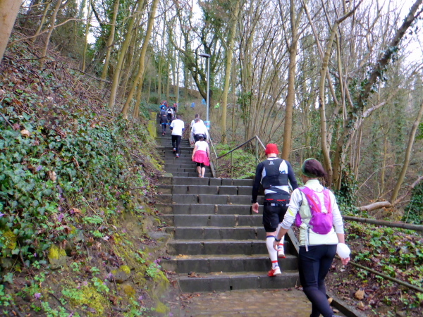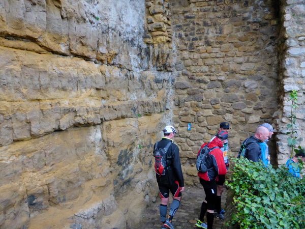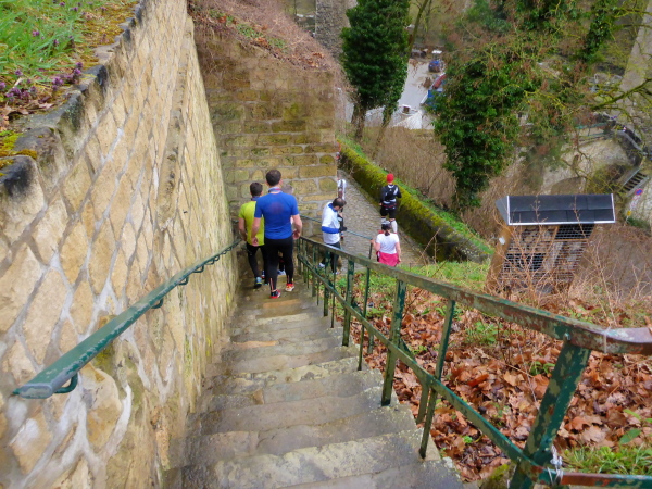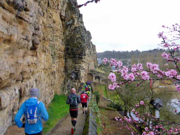 Die Sankt Michaelskirche (km 2), die älteste Kirche Luxemburgs ( 987). Rosige Blüten der Mandelbäumchen vor uralten Höhlenverstecken. Stau an der Wendeltreppe. Abtei Münster, über uns schnelle Läufer? Vielleicht die 13 km Läufer? Unter uns Läufer? Vielleicht die 27 km Läufer, oder gehören die zu meiner Gruppe?