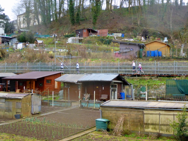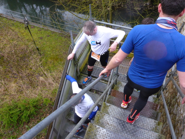 Das stetige Hoch und Hinunter in laufbarer Abwechslung macht große Freude. Jeweils zwei Stufen hechte ich hinauf, nur die Stufen hinab bereiten bei der Nässe Probleme. Das Stahlgerüst ist dort, weil sich die Laufstrecke kreuzt. Überflüssig, denn eigentlich könnte man….aber deswegen liebe ich diesen Lauf: Kindlicher Unsinn, Spieltrieb des Streckenkommandanten. Ganz große Klasse!