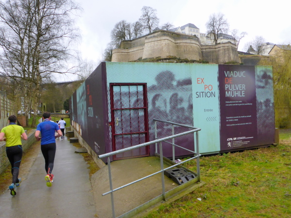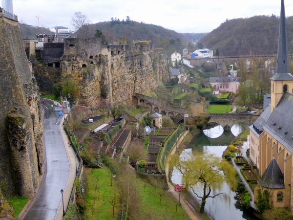 Die Festung Rham wurde von Vauban (siehe Bericht vom letzten Jahr) gebaut. Jetzt sind hier soziale Einrichtungen und ein Altersheim untergebracht. Schöner Ausblick hinüber zur Cornich und der Heilig Geist Zitadelle. Der Standpunkt hier oben ist jetzt von drei Seiten von der Alzett umspühlt. Da wir oben sind, müssen wir wieder runter und über die Brücke und hinauf, das ganze auf 200 Metern. Zum Heulen, es geht sofort hinunter. Freudenheulen!
