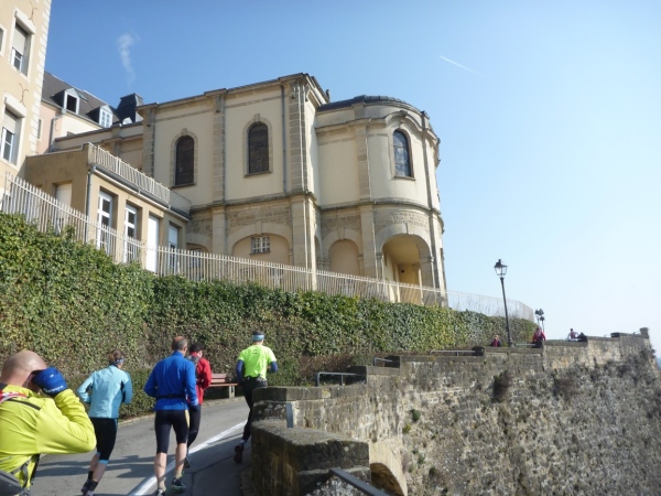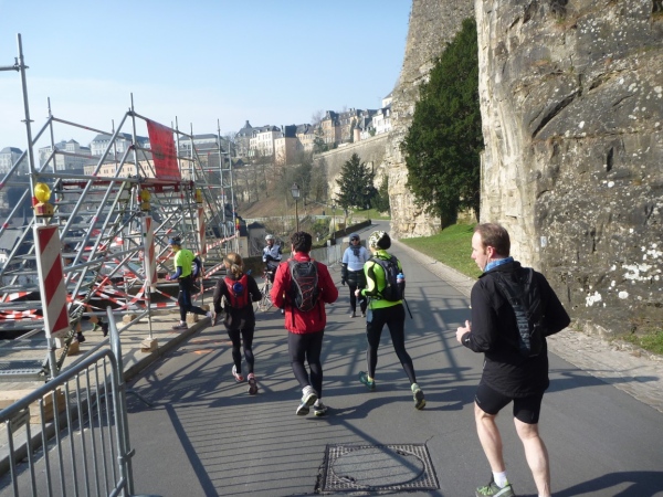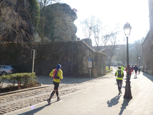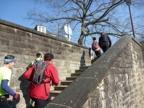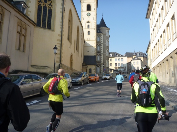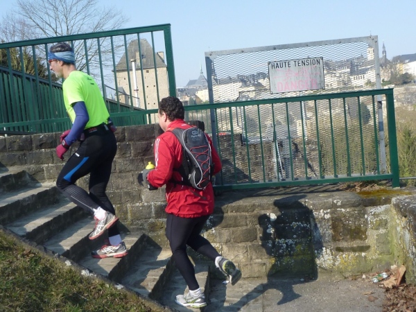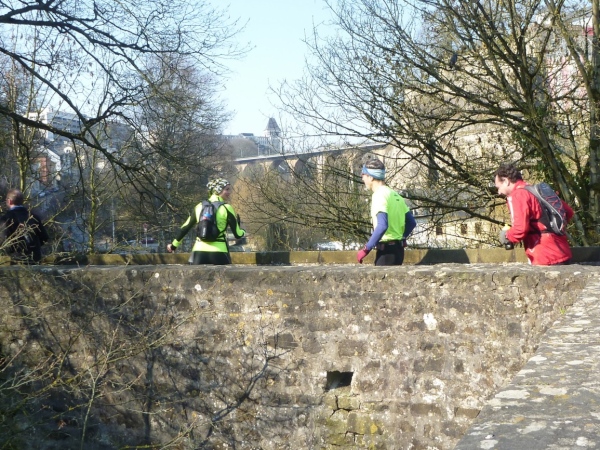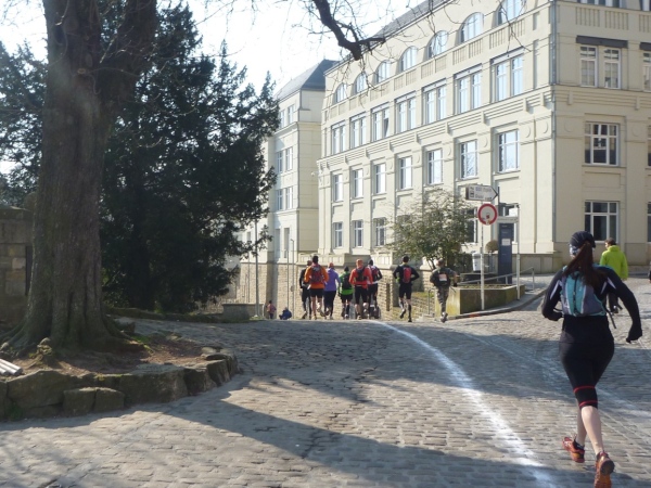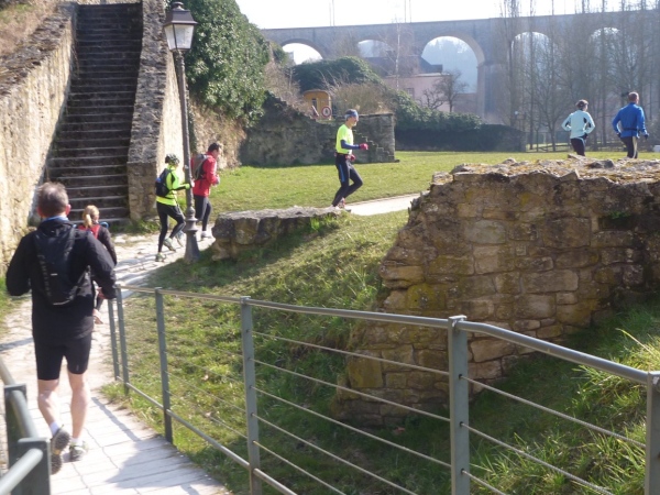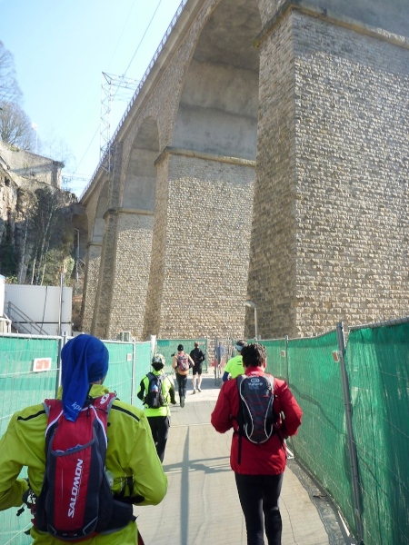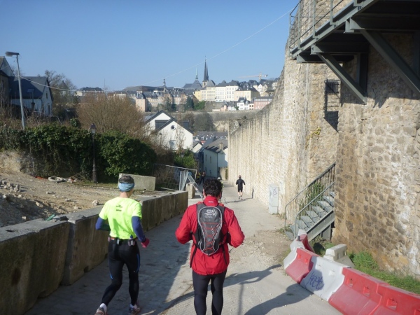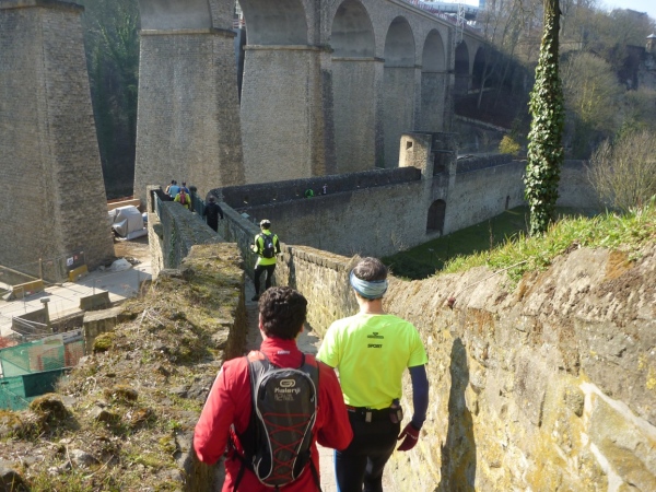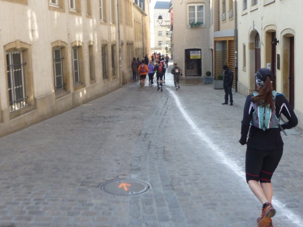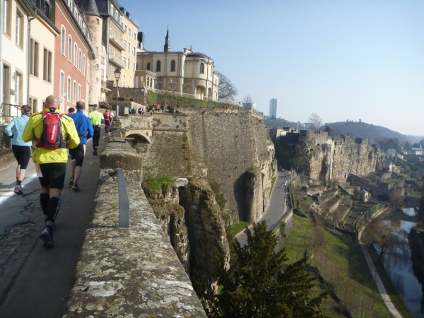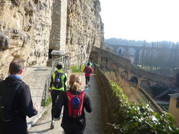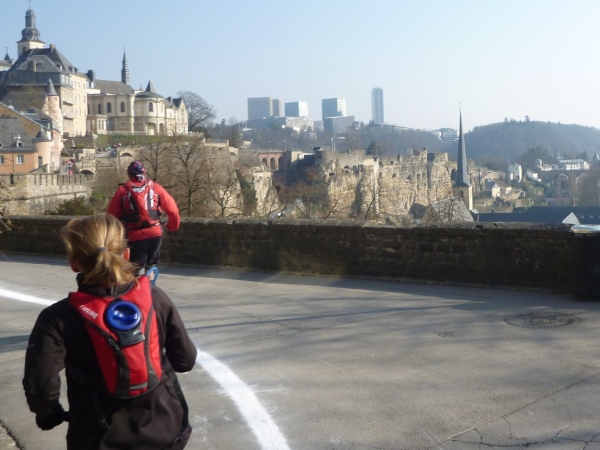 Radieschen auf spanischen Mauern! Luxemburg, lange spanisch, viel französisch, hat alte Mauern in neue integriert. Ich bin hellauf begeistert von dieser Stadt, von diesem Trail, der alles, was ich bisher erlebte, in den Schatten stellt. Ich bin dankbar, ein seltenes Hobby ausüben zu können, fit zu sein und berichten zu dürfen, laufe über schmale Mauersimse, steile Treppen, metallene Strukturen, die so stark wippen, dass es mich und die Besenradler aus dem Rhythmus wirft, über steile Abschnitte und mit funkelnder Begeisterung in den glänzenden Augen.