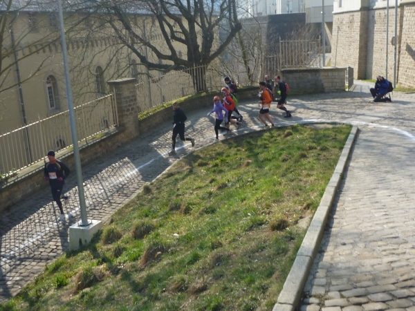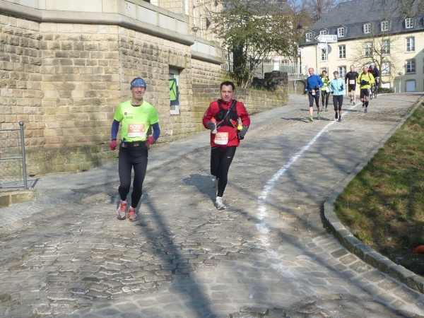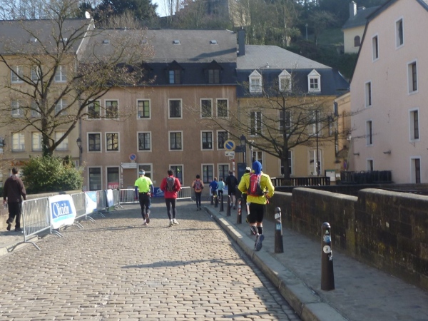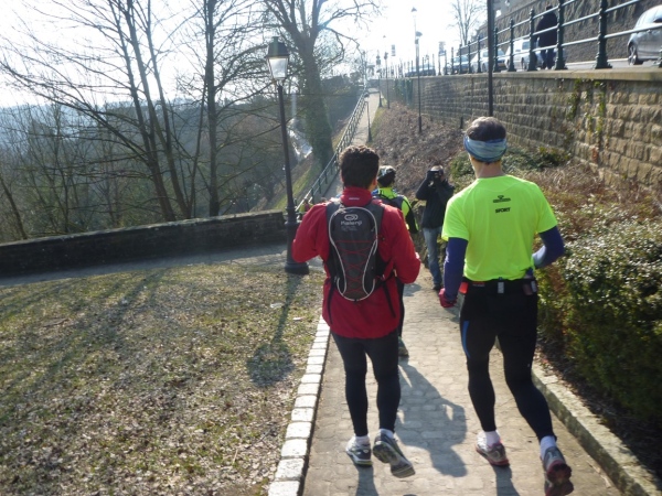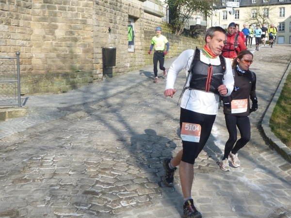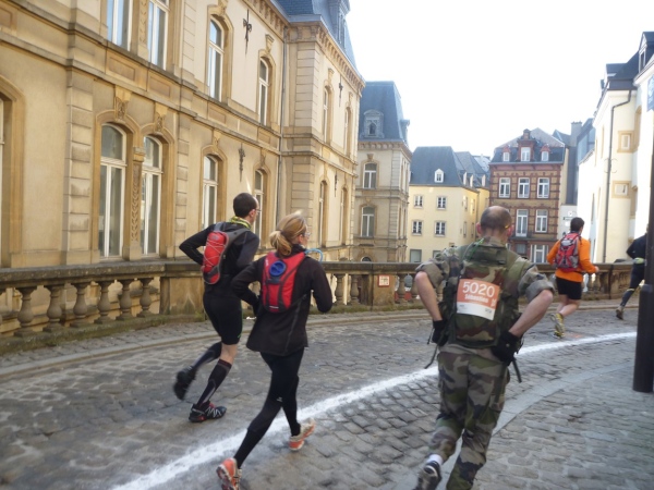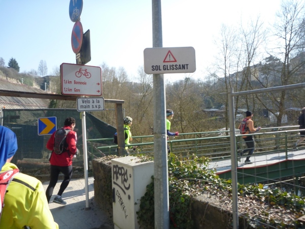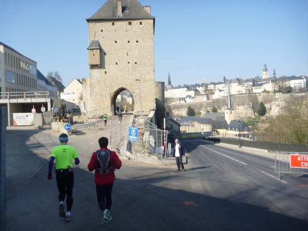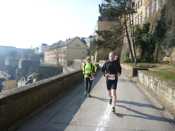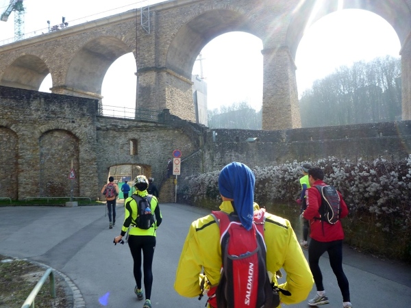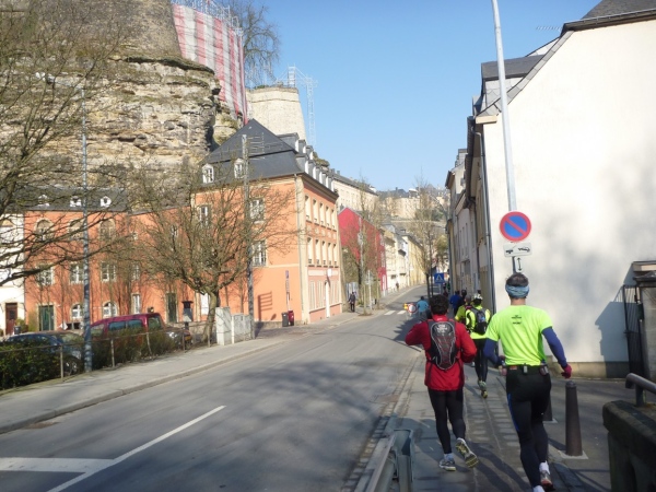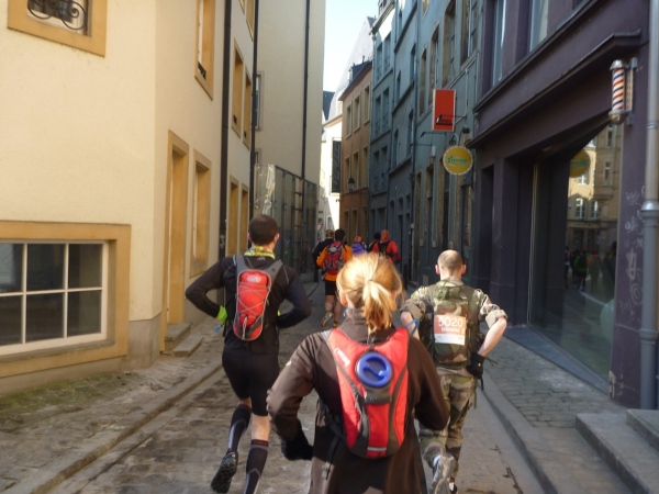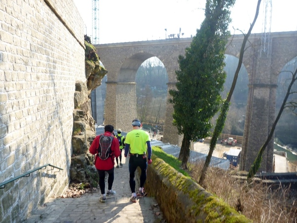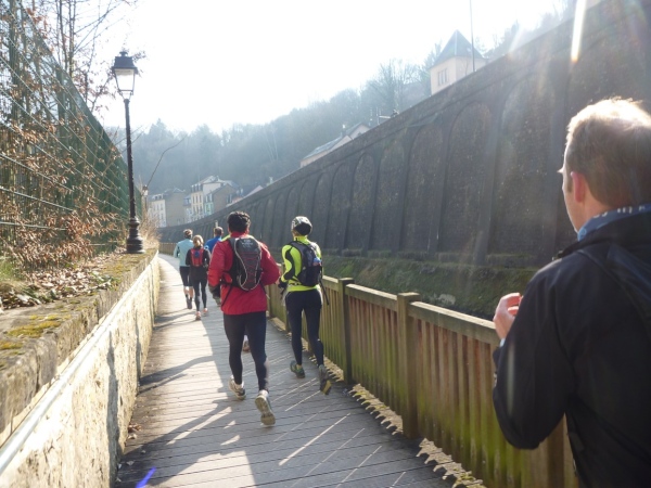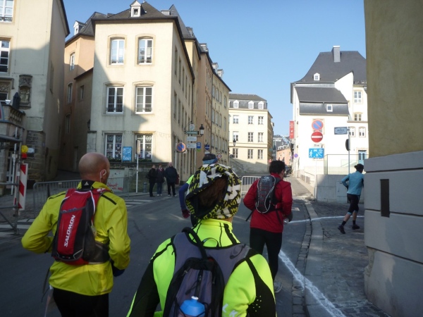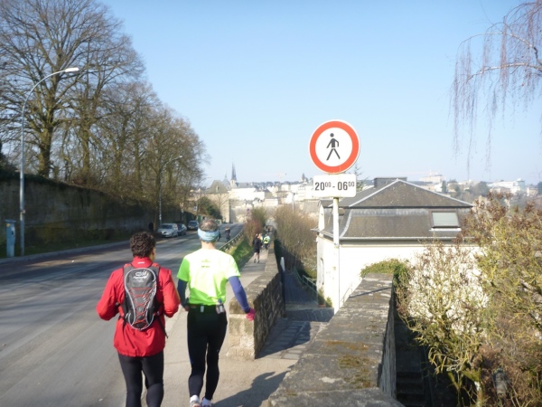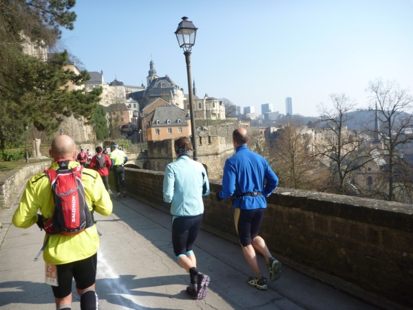 Radieschen auf spanischen Mauern! Luxemburg, lange spanisch, viel französisch, hat alte Mauern in neue integriert. Ich bin hellauf begeistert von dieser Stadt, von diesem Trail, der alles, was ich bisher erlebte, in den Schatten stellt. Ich bin dankbar, ein seltenes Hobby ausüben zu können, fit zu sein und berichten zu dürfen, laufe über schmale Mauersimse, steile Treppen, metallene Strukturen, die so stark wippen, dass es mich und die Besenradler aus dem Rhythmus wirft, über steile Abschnitte und mit funkelnder Begeisterung in den glänzenden Augen.