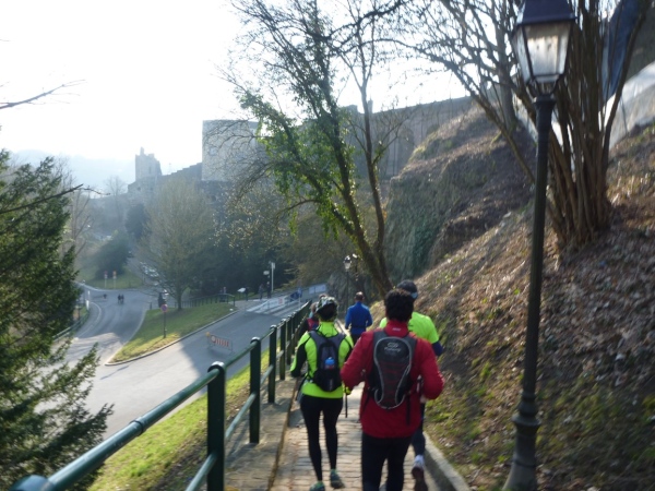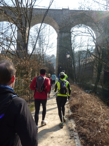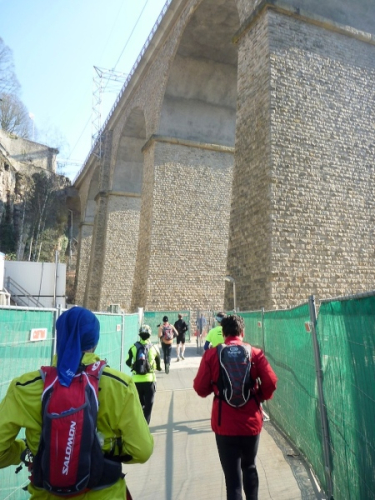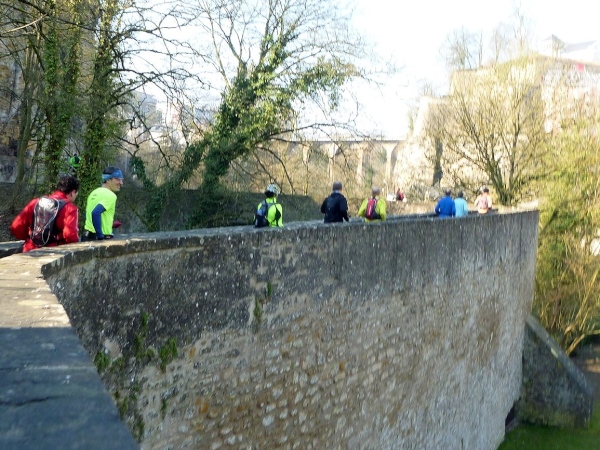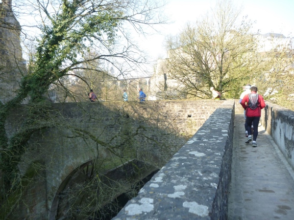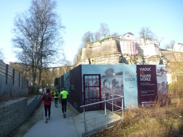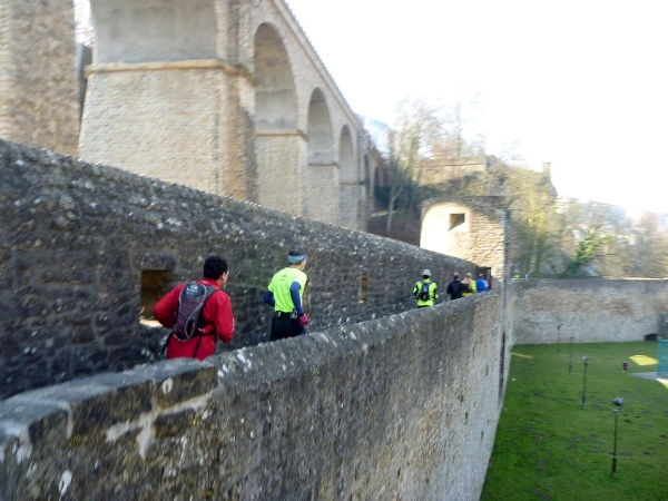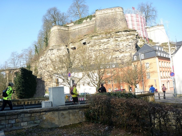 Dann geht es eine Schicht tiefer in das Tal der Petruss mit der Bourbon-Schleuse von 1728, die das gesamte Tal zu Verteidigungszwecken fluten sollte, dann zur Bastion Beck, während der ersten spanischen Herrschaft erbaut, über uns Cornich, der schönste Balkon Europas, darunter die Schießscharten, die Spanische Türmchen, oder wo war das? Wo bin ich? Schon am Bock Felsen? Bock-Kasematten, Petruss-Kasematten, Wenzel-Rundweg, und ganz hinten die Quirinius-Kapelle. Oh, wie geil ist das denn!